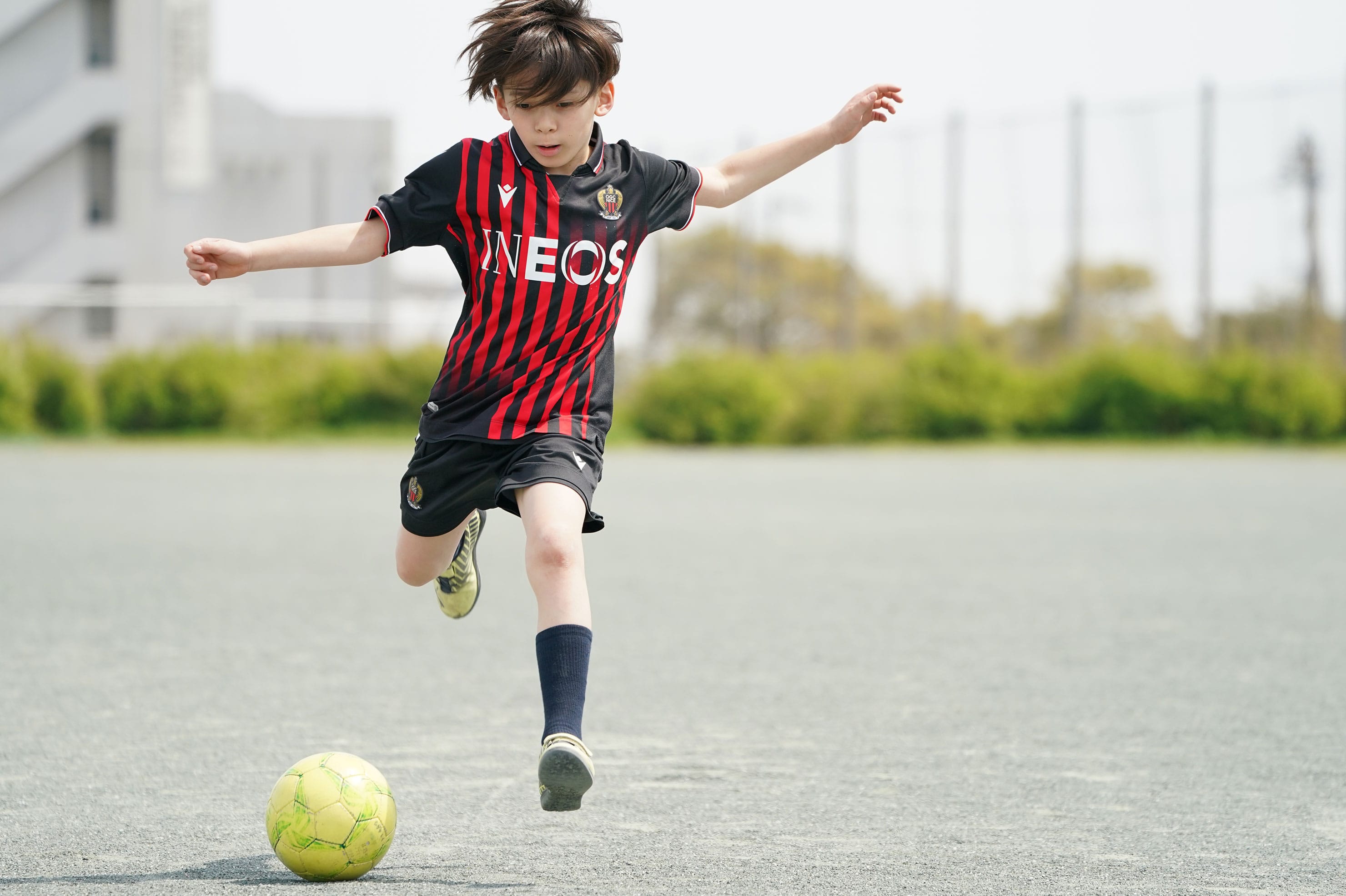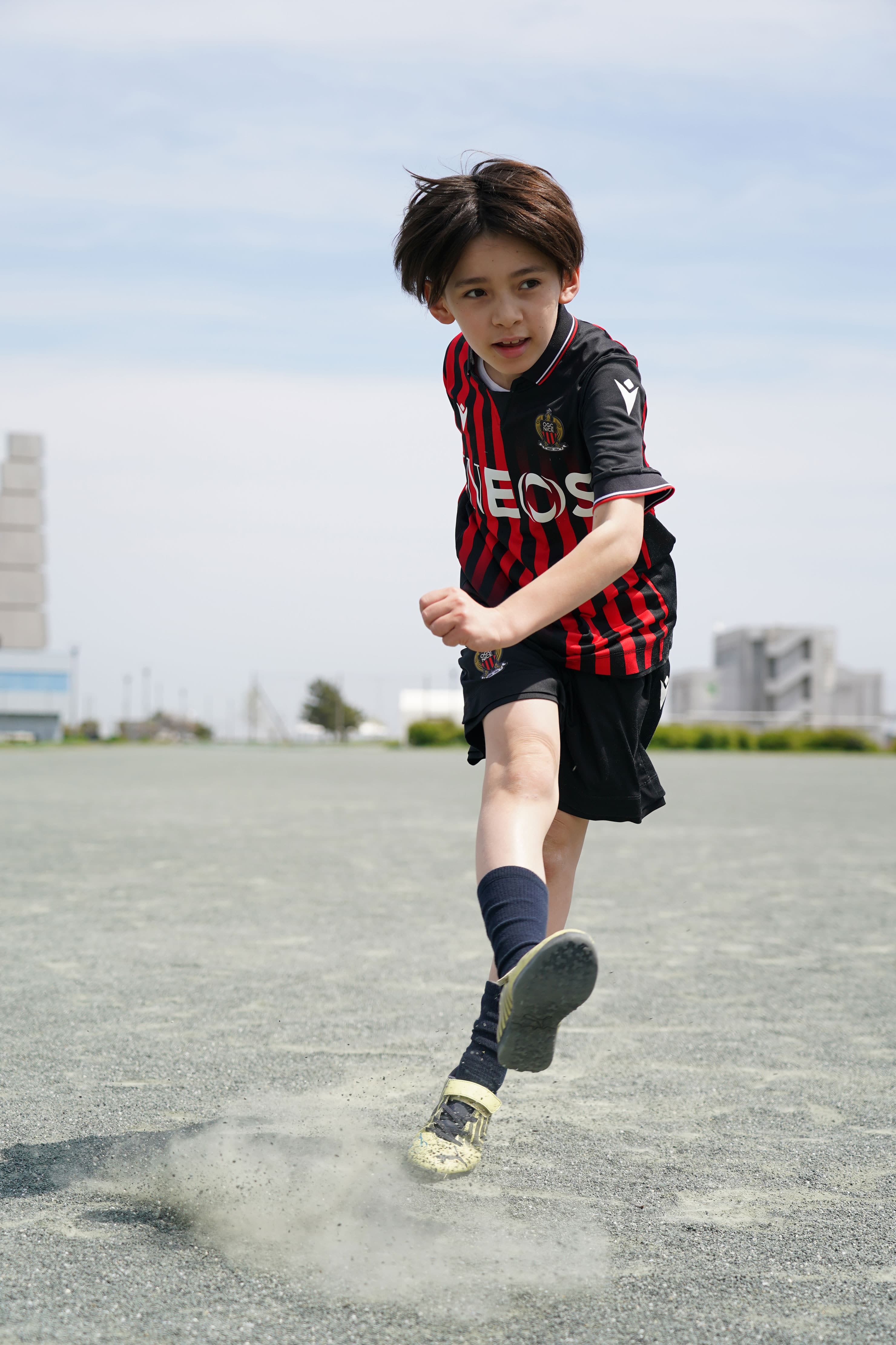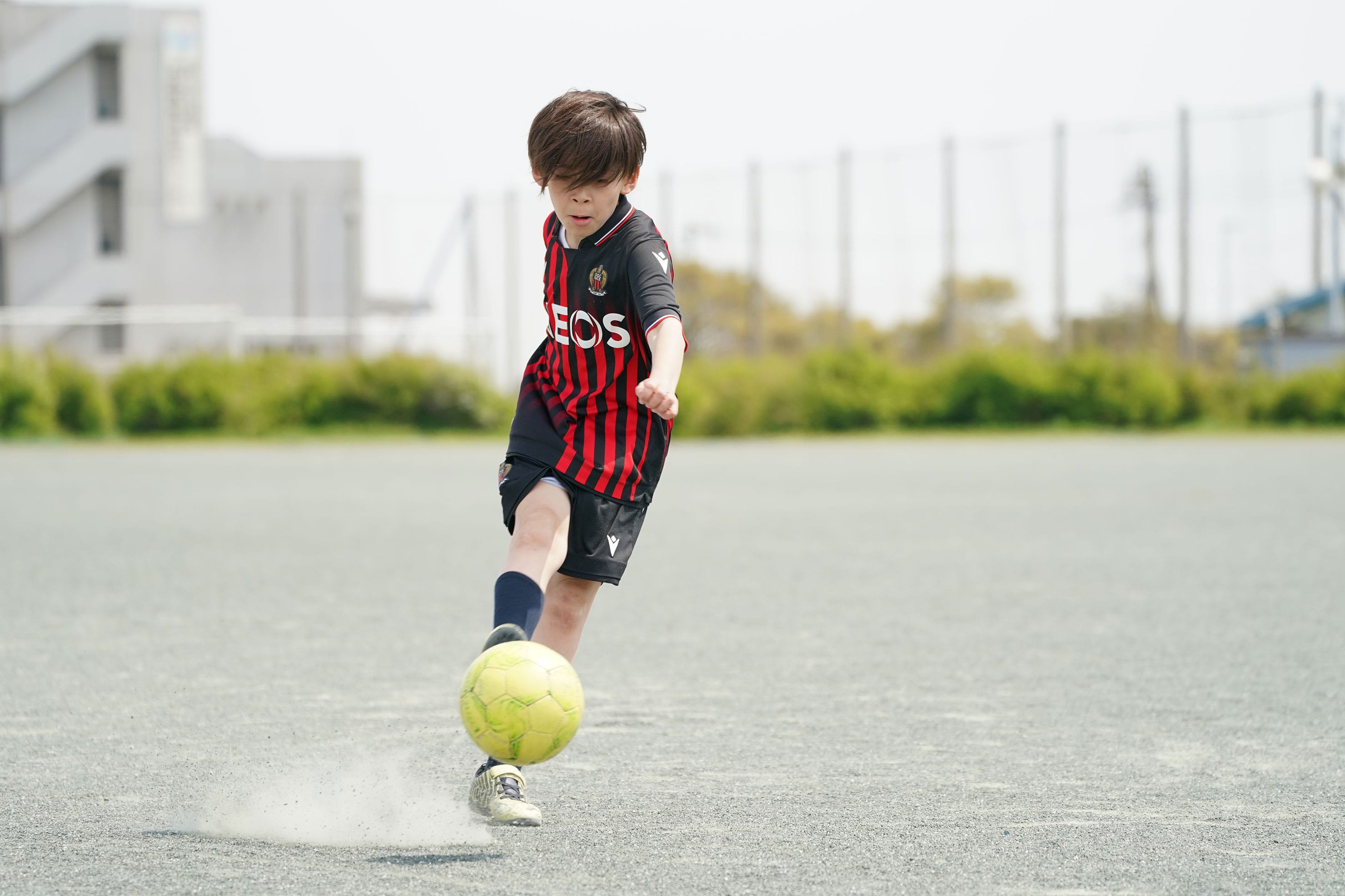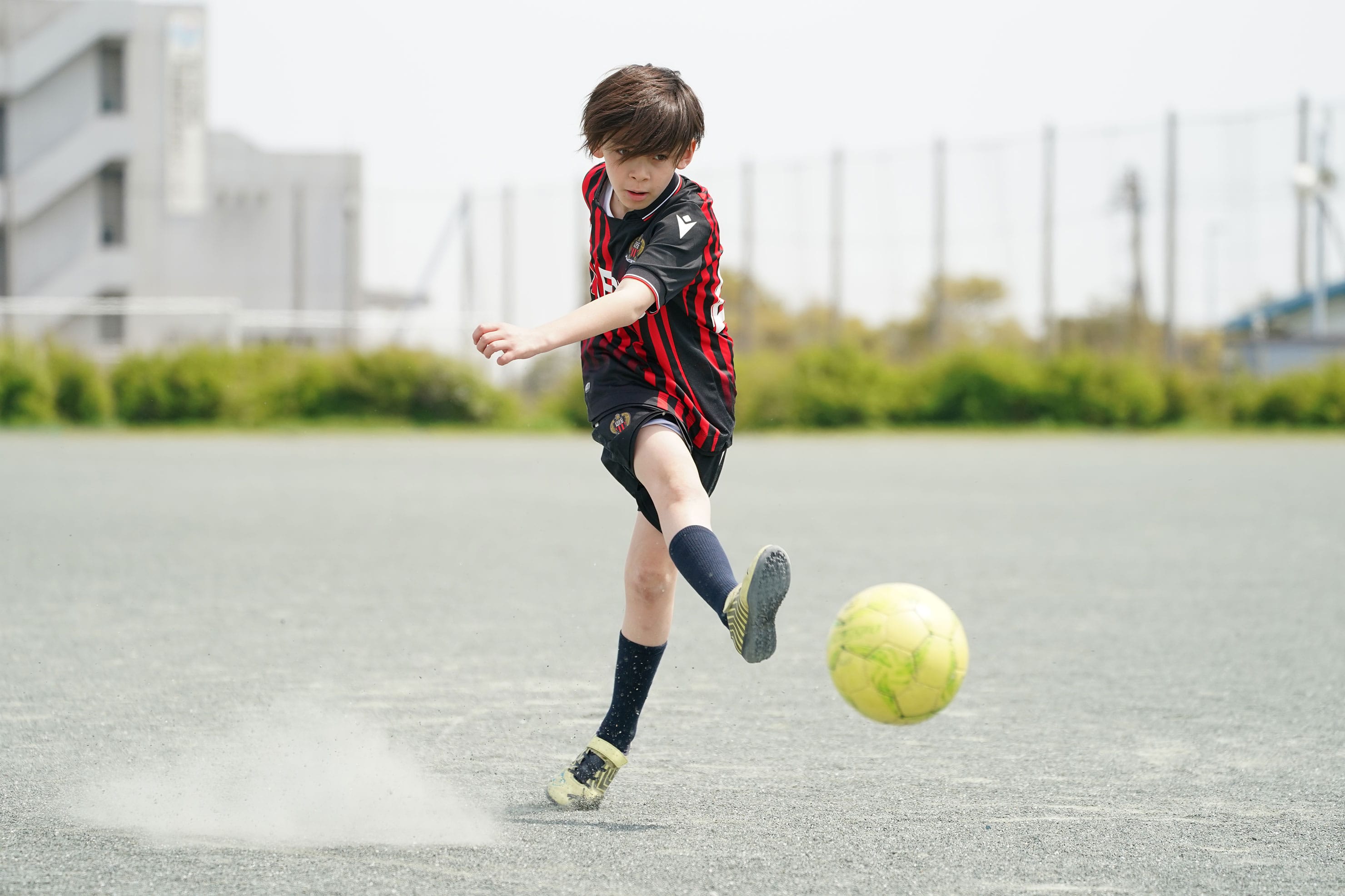 フリーキックを想定したシーン。近距離で迫力を出したかったので24-105mmズームのおよそ60mm付近の画角で撮影。セットしたボールから数メートル程度の近距離のローポジションで連続撮影。