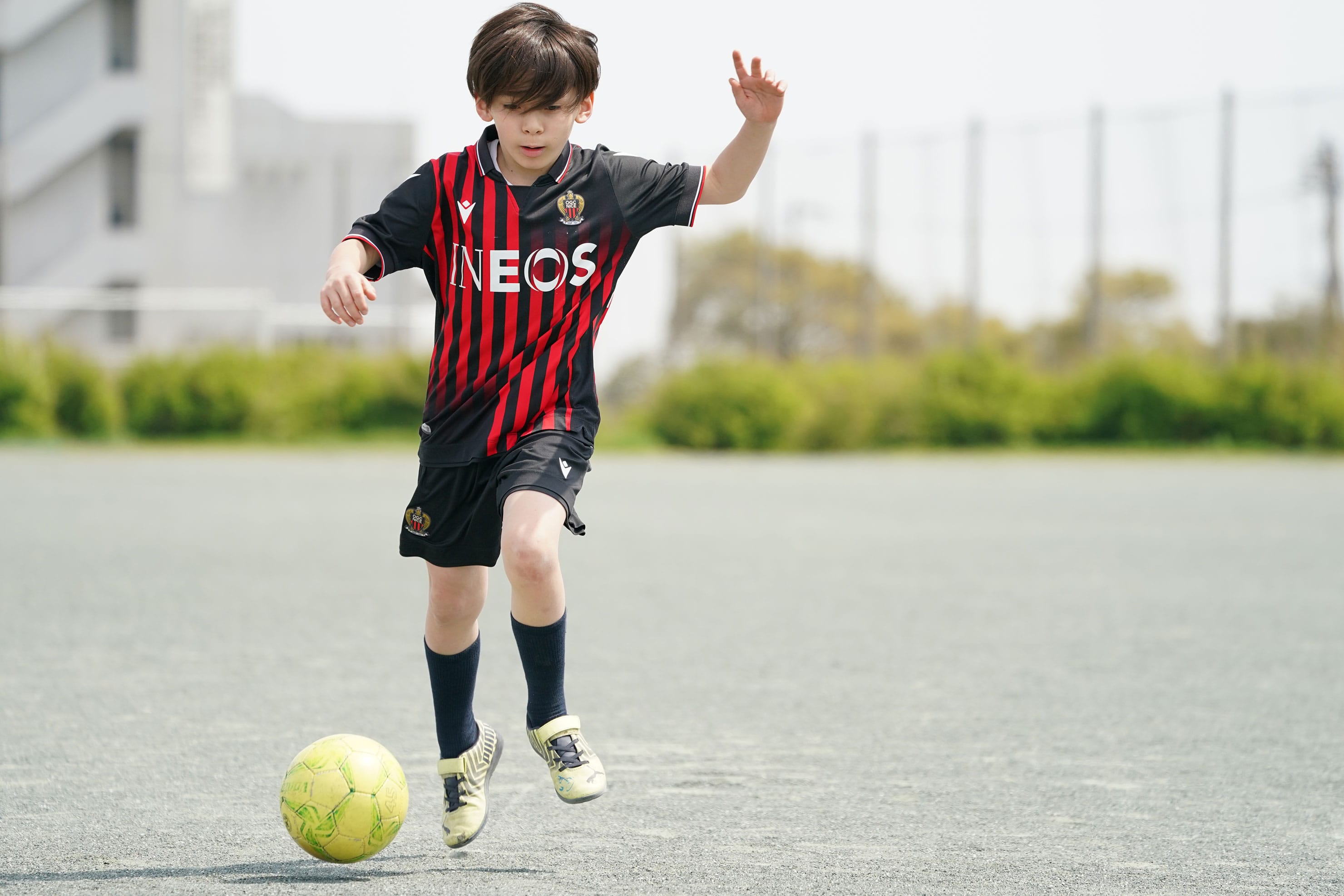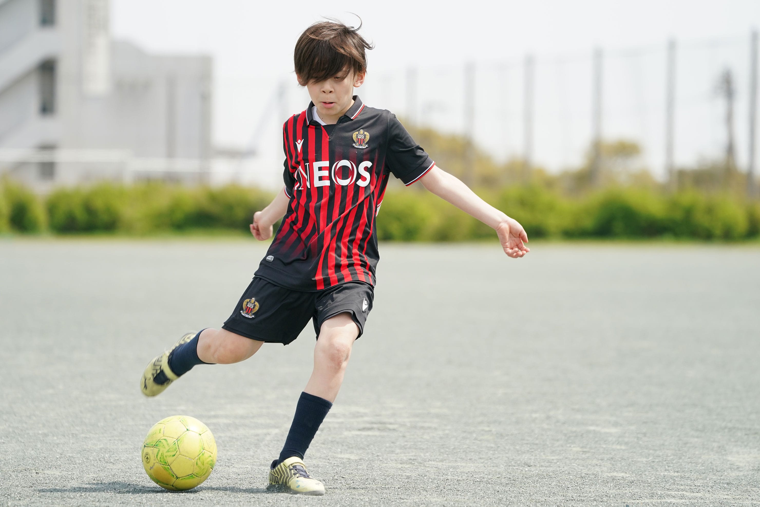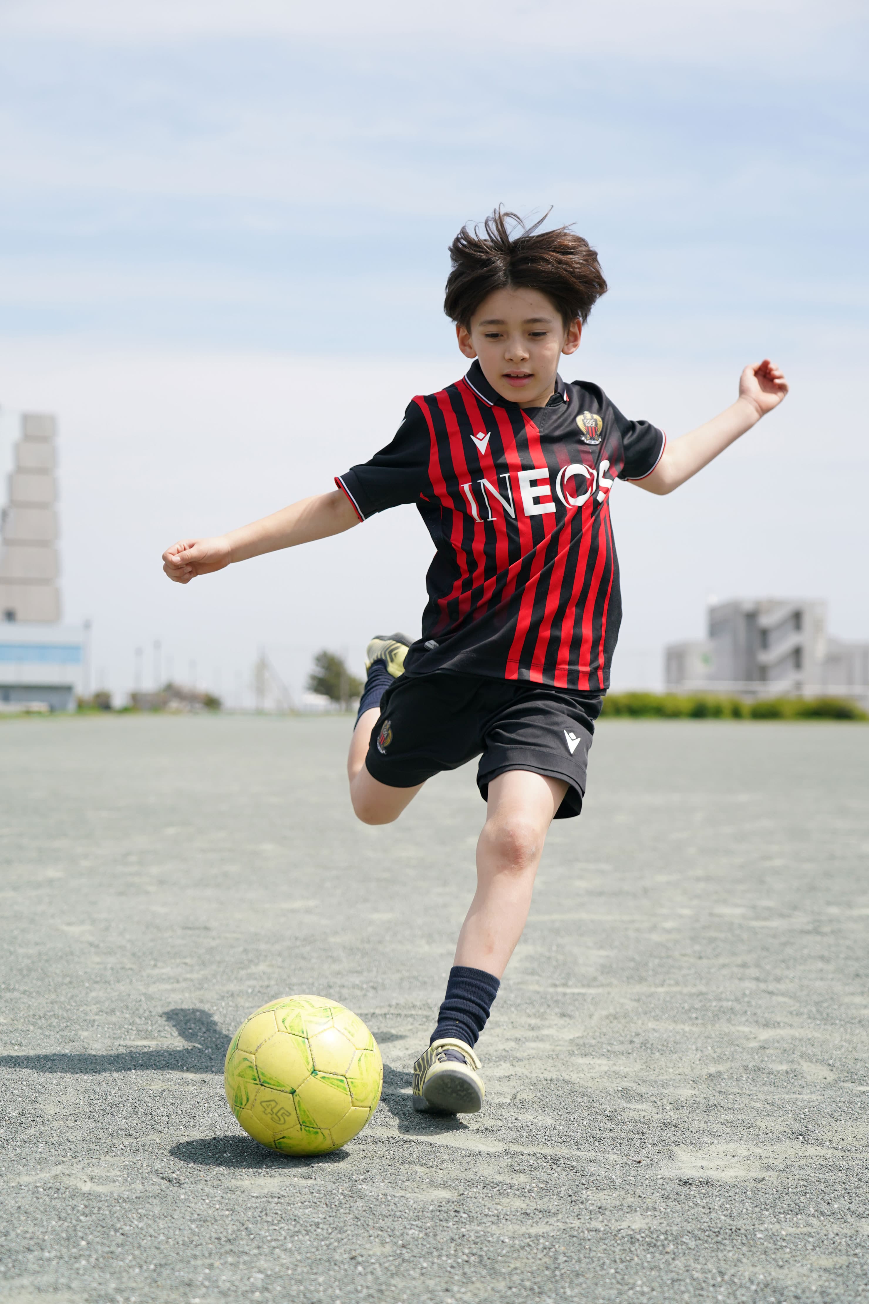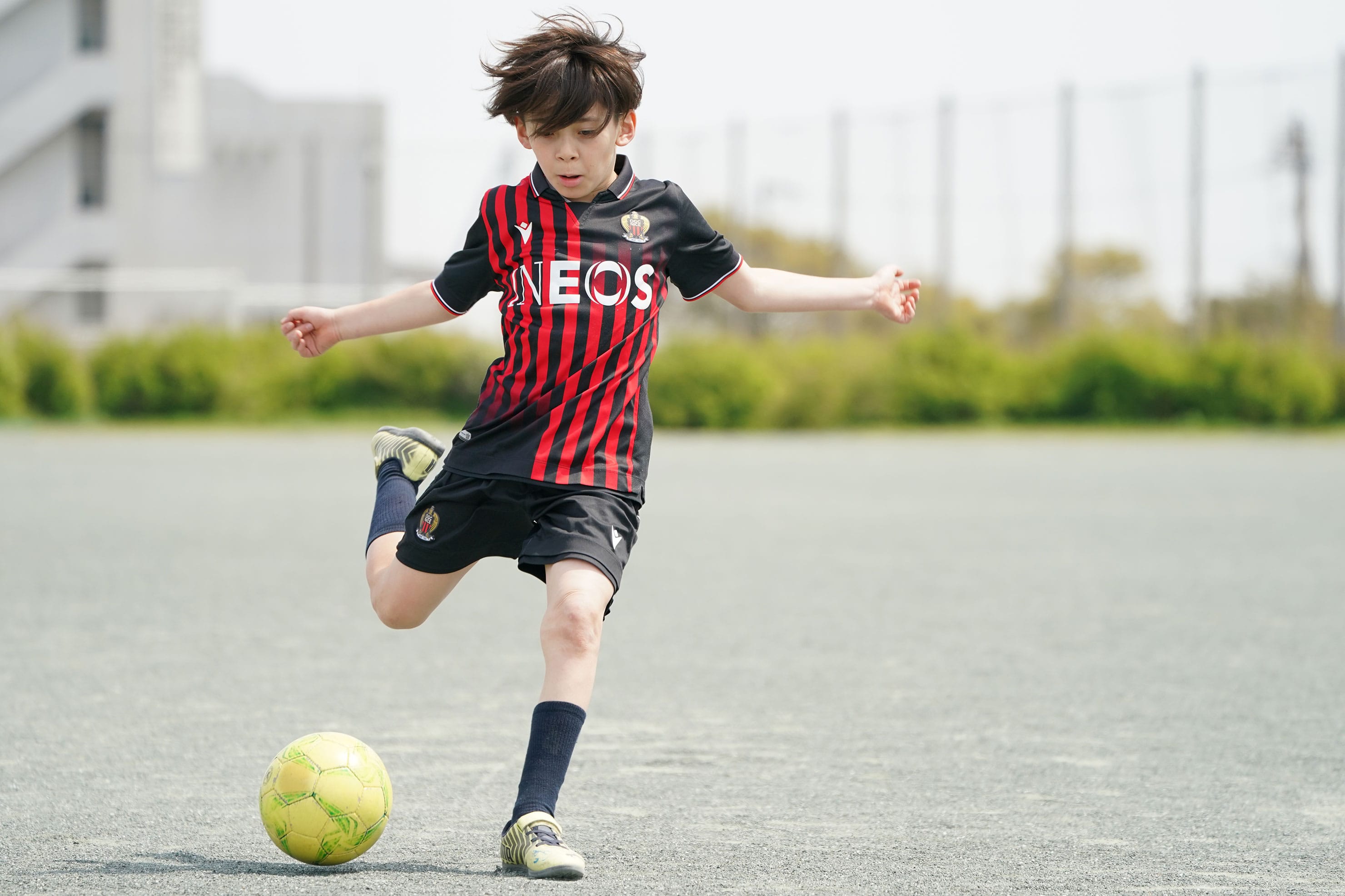 フリーキックを想定したシーン。近距離で迫力を出したかったので24-105mmズームのおよそ60mm付近の画角で撮影。セットしたボールから数メートル程度の近距離のローポジションで連続撮影。