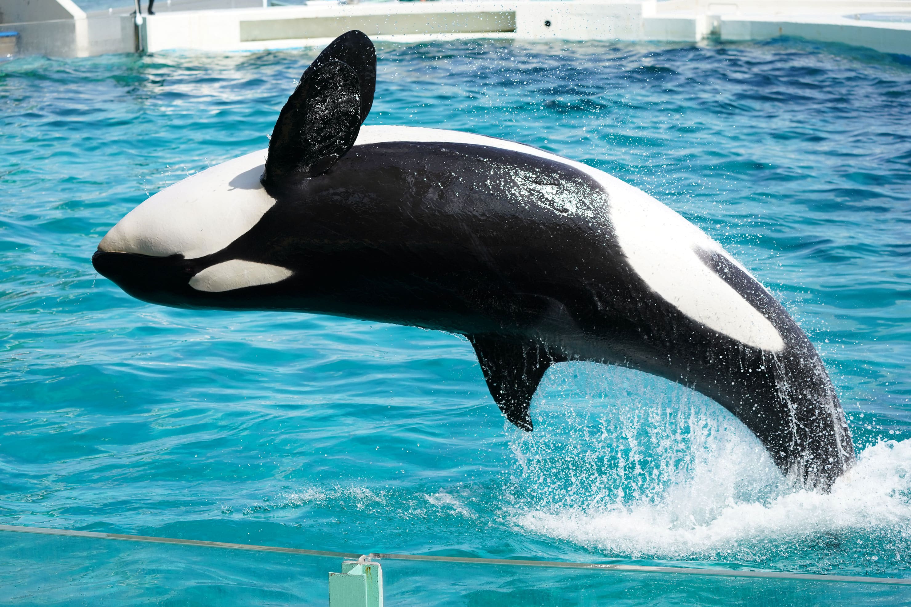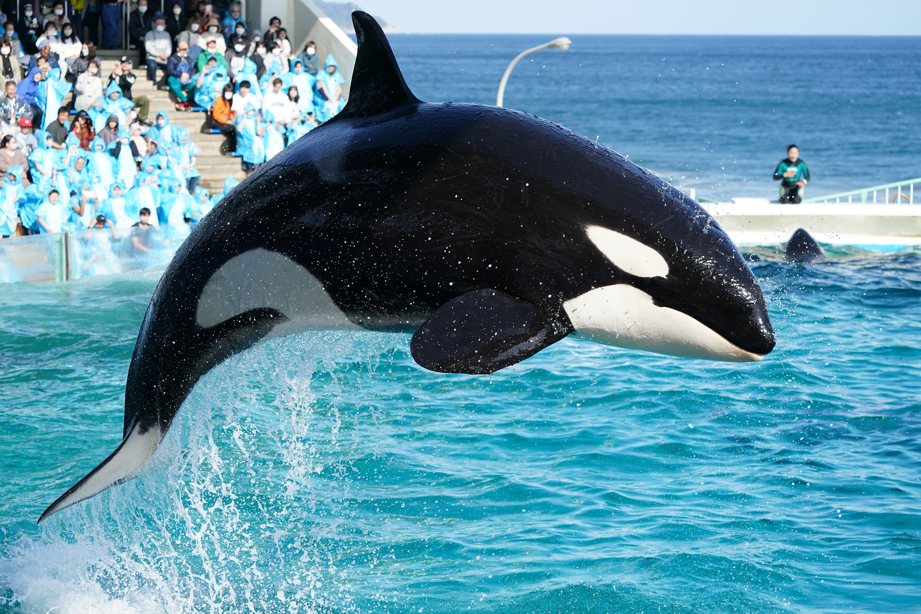 ここまでの作例は被写体を予め捕捉していた状態からの動体撮影でしたが、つぎは「撮りたい!」と思った瞬間に対するAFの適応力を試すため、魅力的な被写体が多くこういった撮影にはうってつけのスポット「鴨川シーワールド」にお邪魔して、シャチのジャンプをピントの合焦の良否が判別しやすい望遠ズームで撮影してみました。