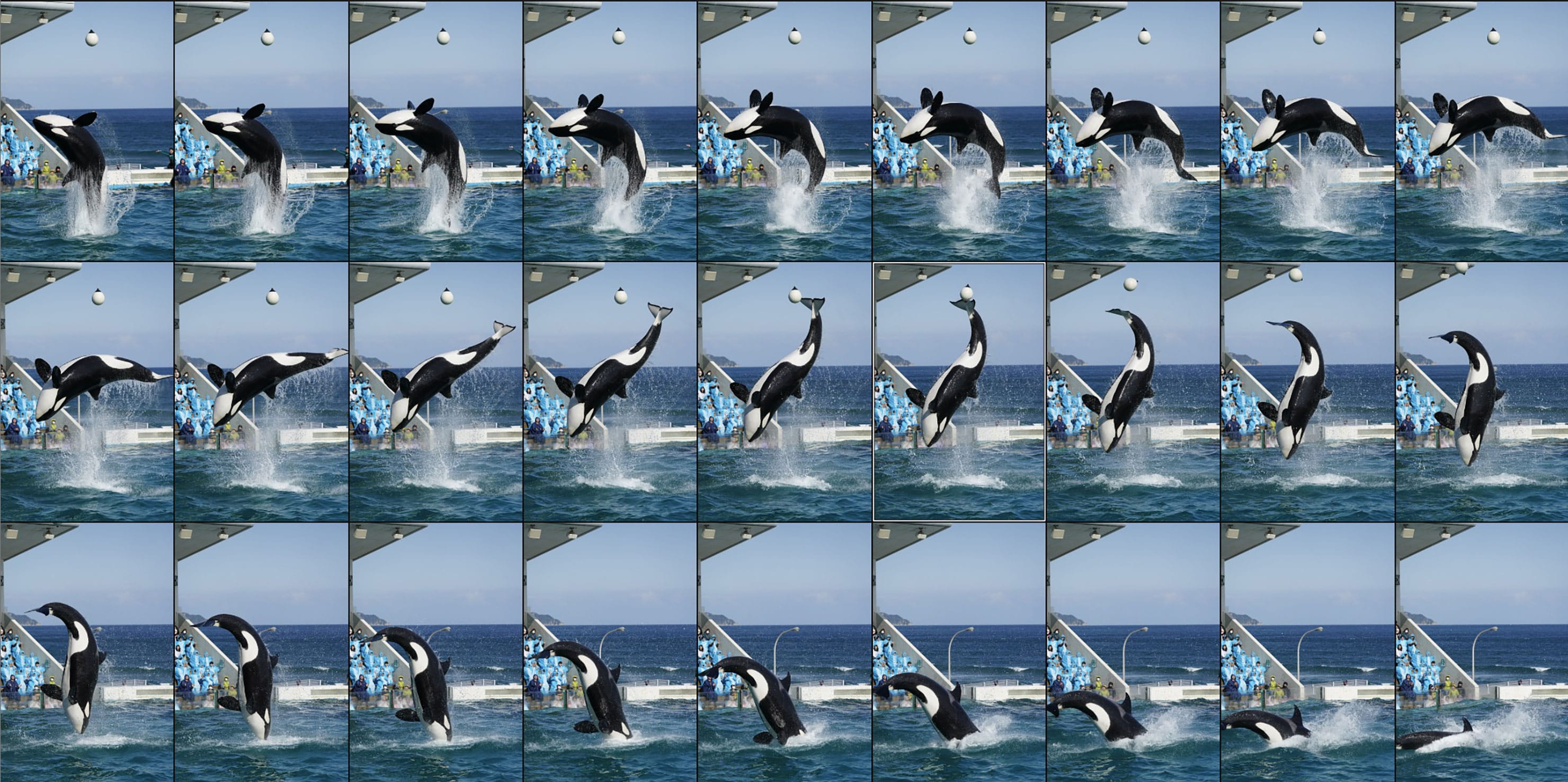 吊り下げられたボールをシャチがテールで叩くジャンプを20fpsで連続撮影した画像を並べました。27コマのうち20コマが1秒間。