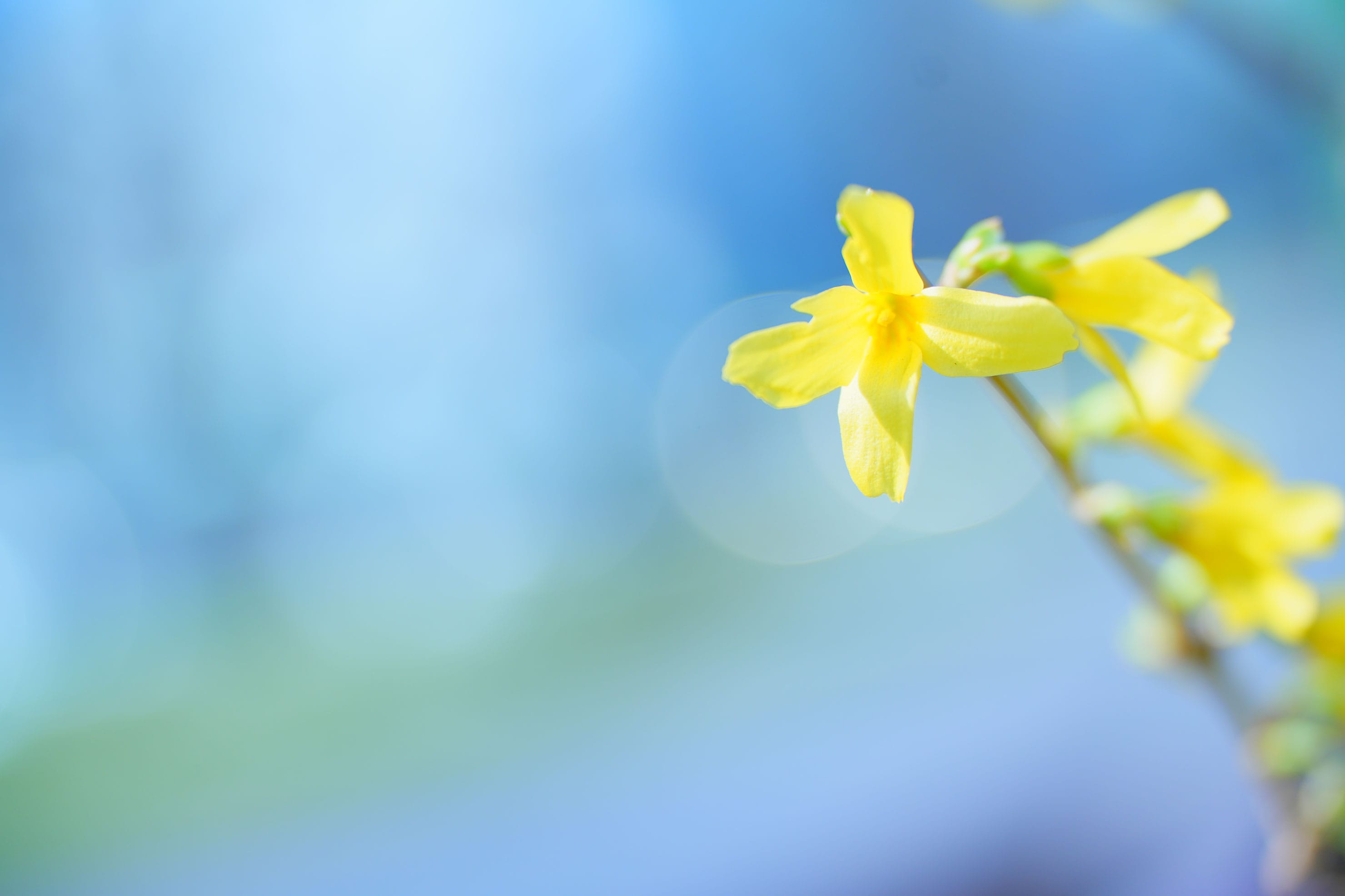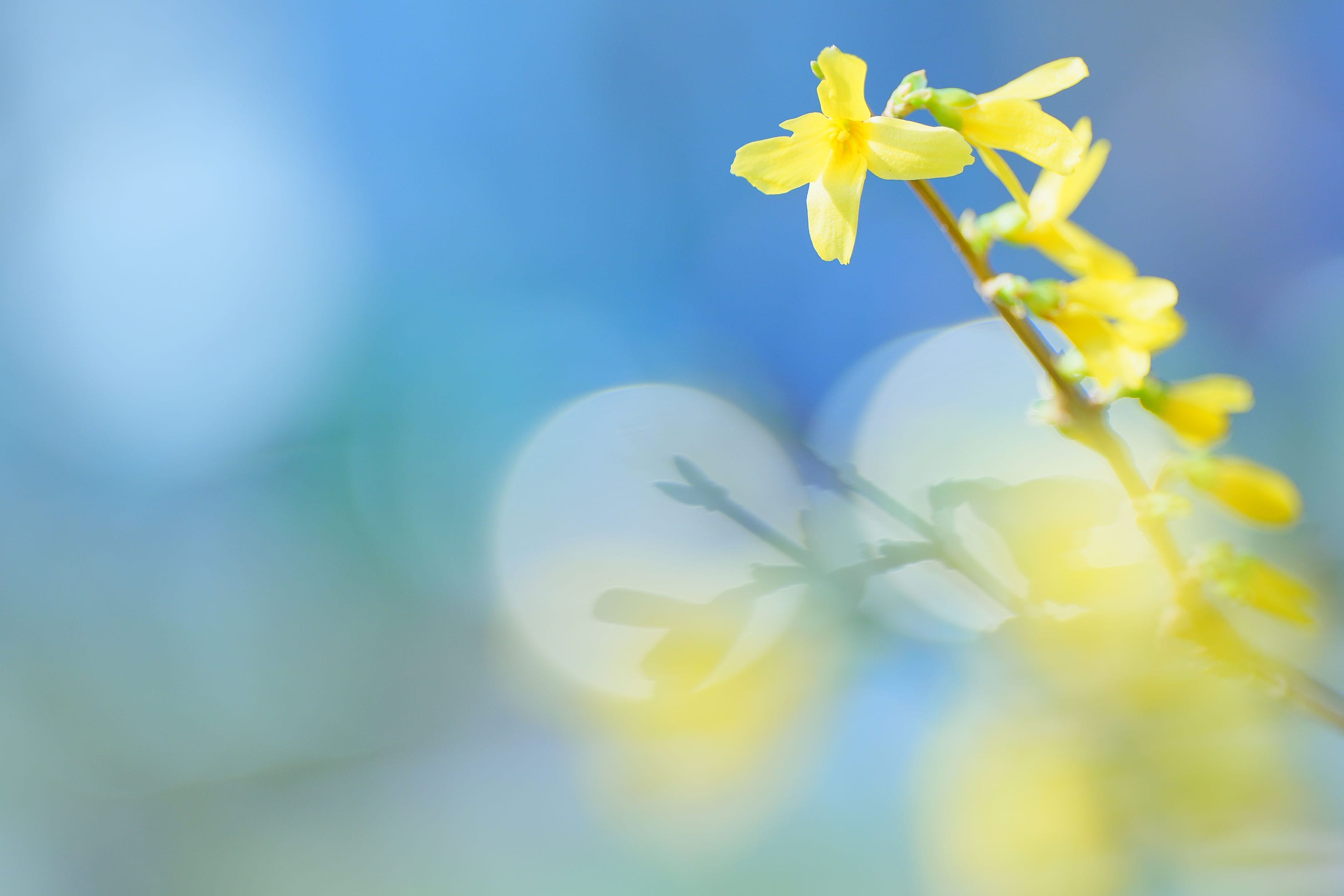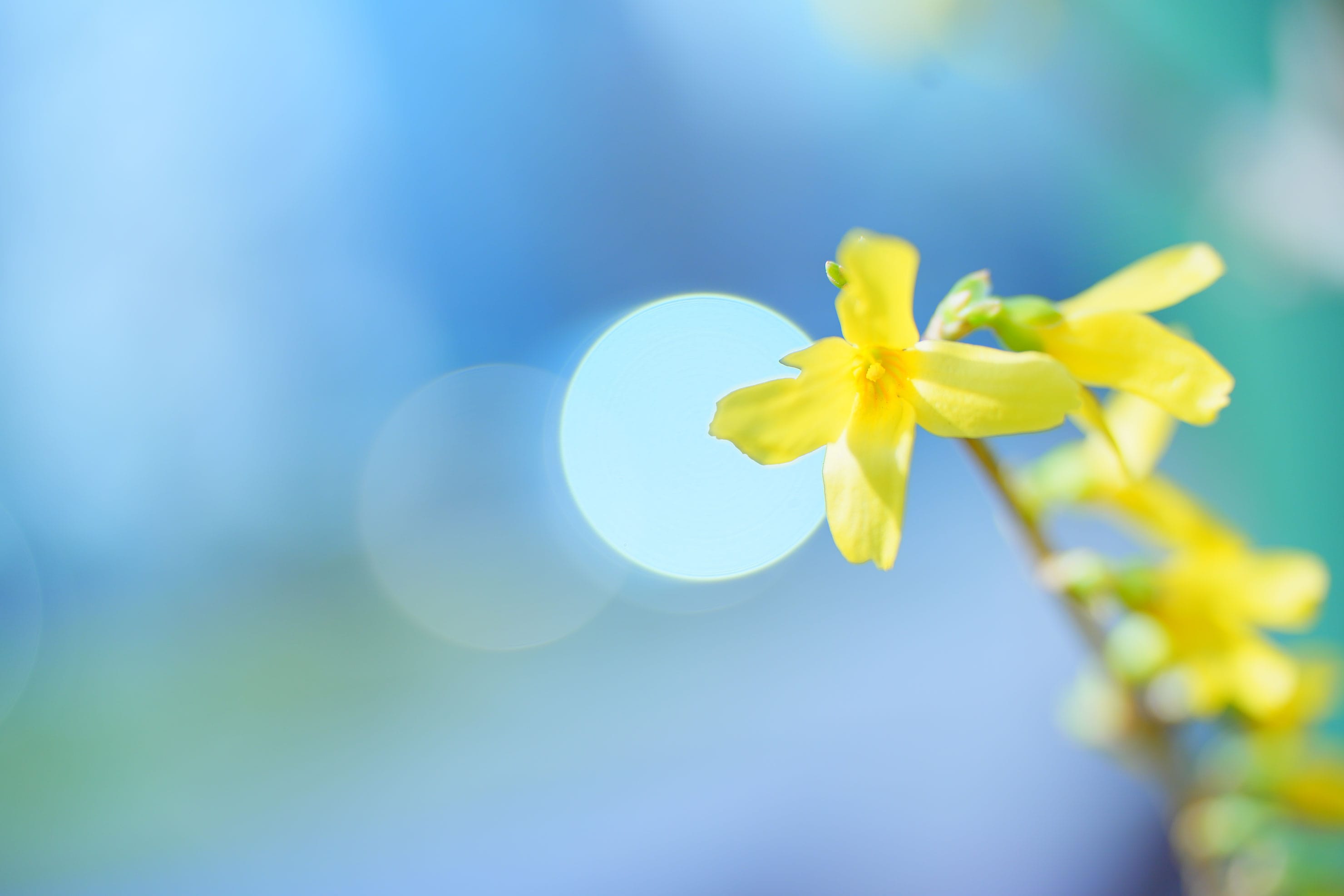 街を歩いていると、冬と春の境の時期らしく、お花がなかなか咲いていない。遠くに雪山が見える。やっと見つけた黄色いお花レンギョウを撮影してみる。ワイド端(焦点距離70mm)にして、レンギョウから少し離れて撮影。