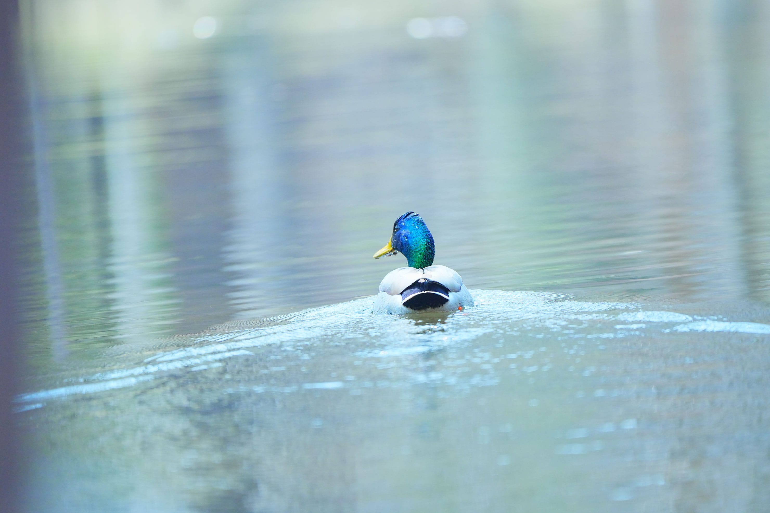 池の方からバサバサッと音が聞こえたので近づいてみる。マガモがすいすいと池を泳いでいた。