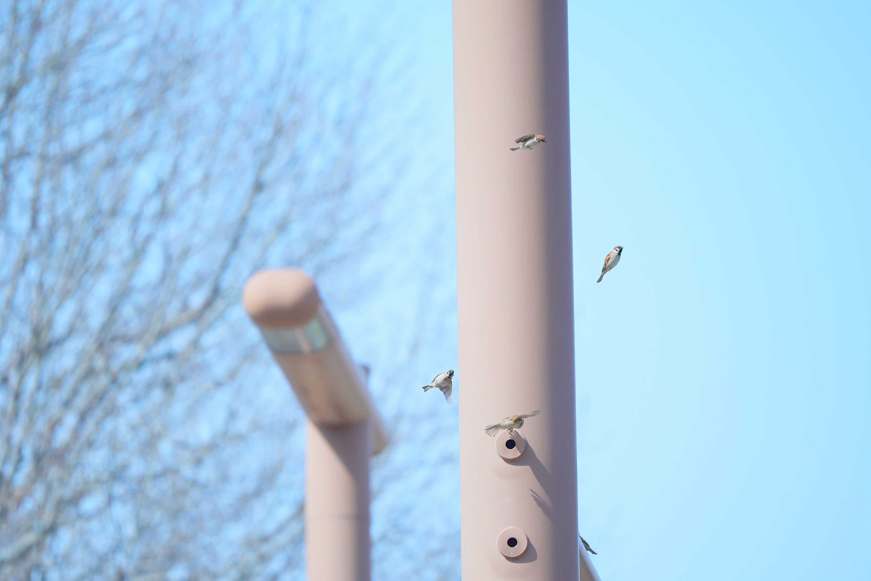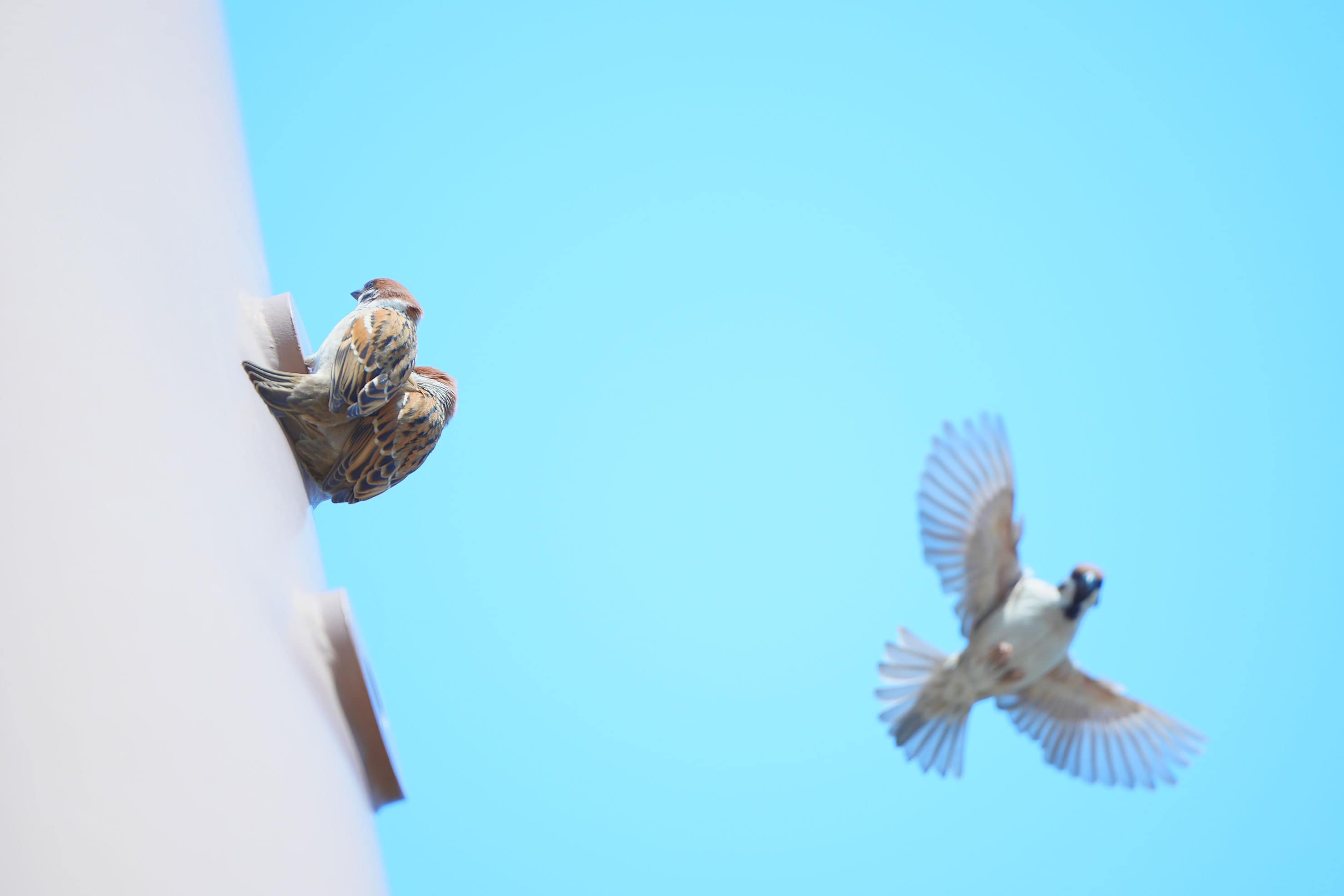 少し近づいてみる。スズメたちのチュンチュンと楽しそうに羽ばたく様子がとても可愛らしい。思わずにっこりとしながらしばらく撮影した。