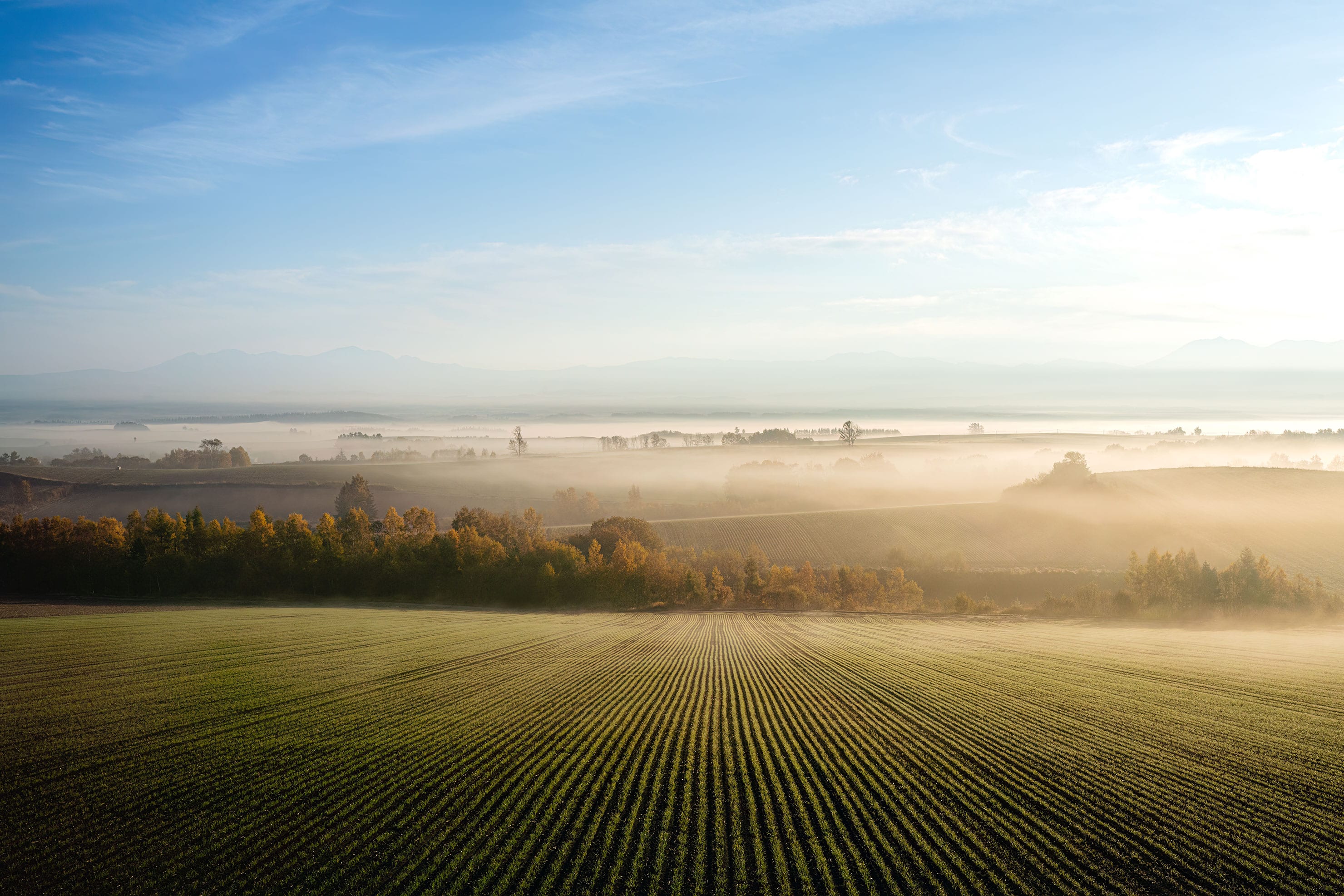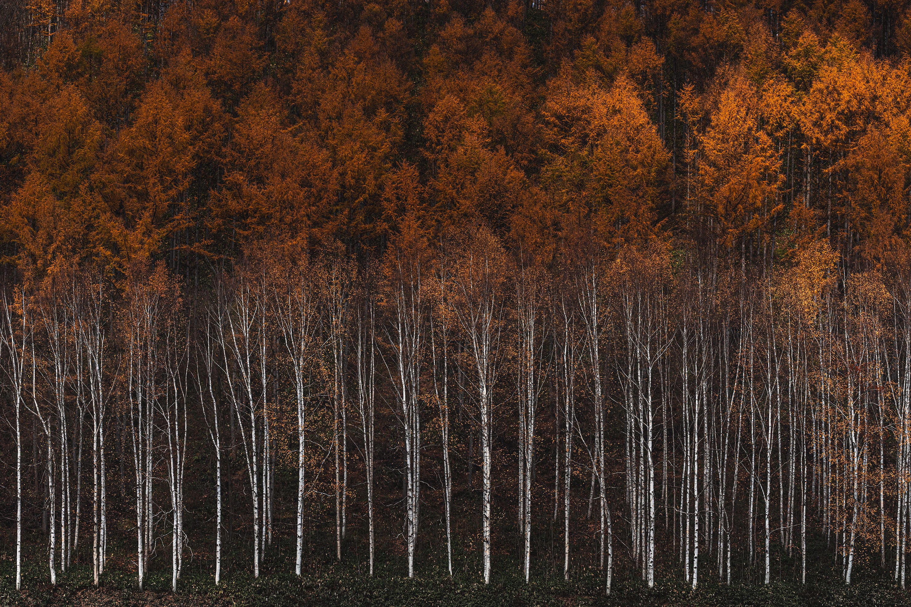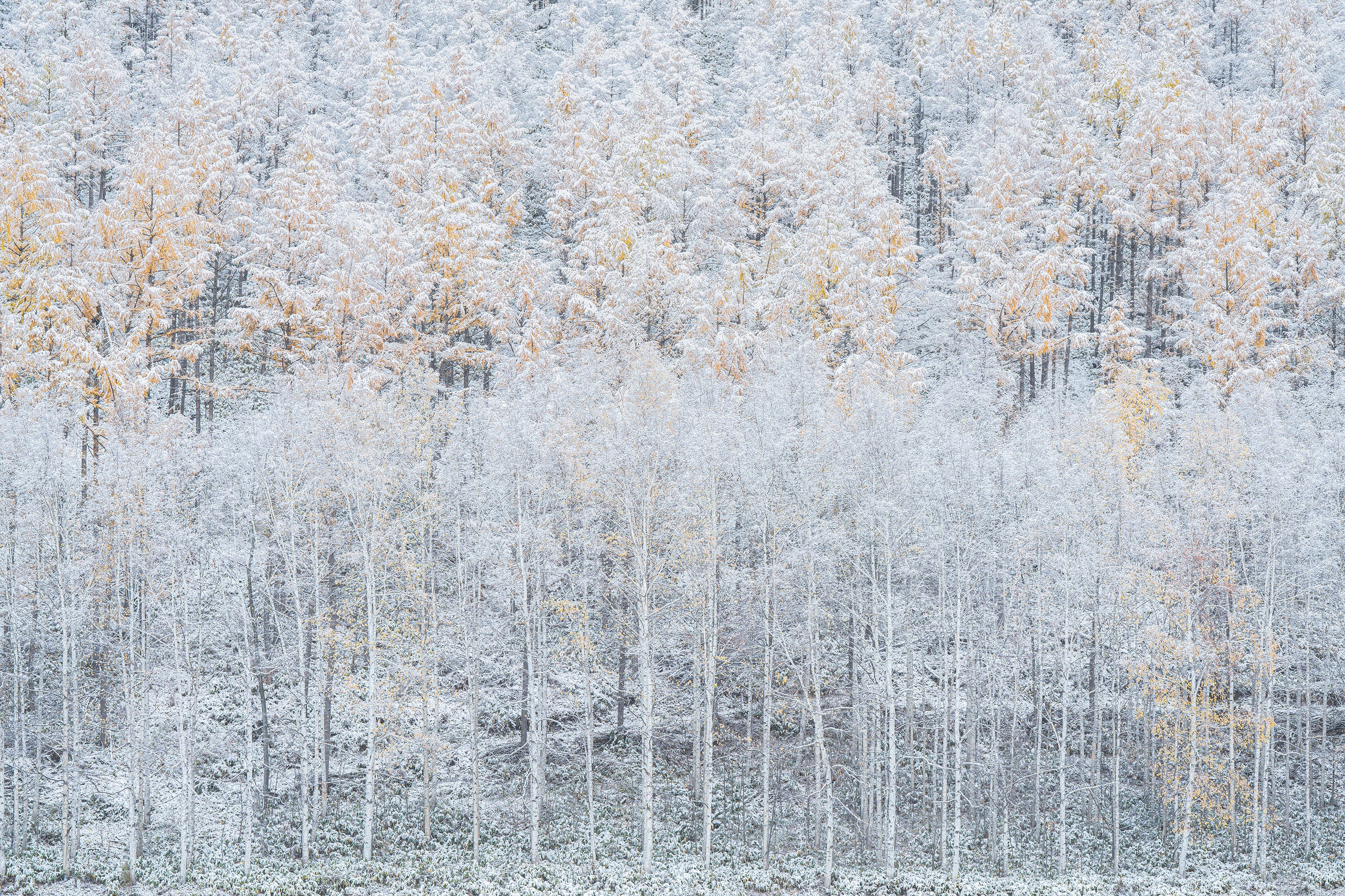 カラマツと白樺の木立に気の早い雪が降った。雪化粧をした風景は、ときに立体感を失うようにベタッとした描写になることがあるが、α7RⅣで撮影したデータには木々に積もった雪の階調が見えるために、立体感を失わずに仕上がっている。