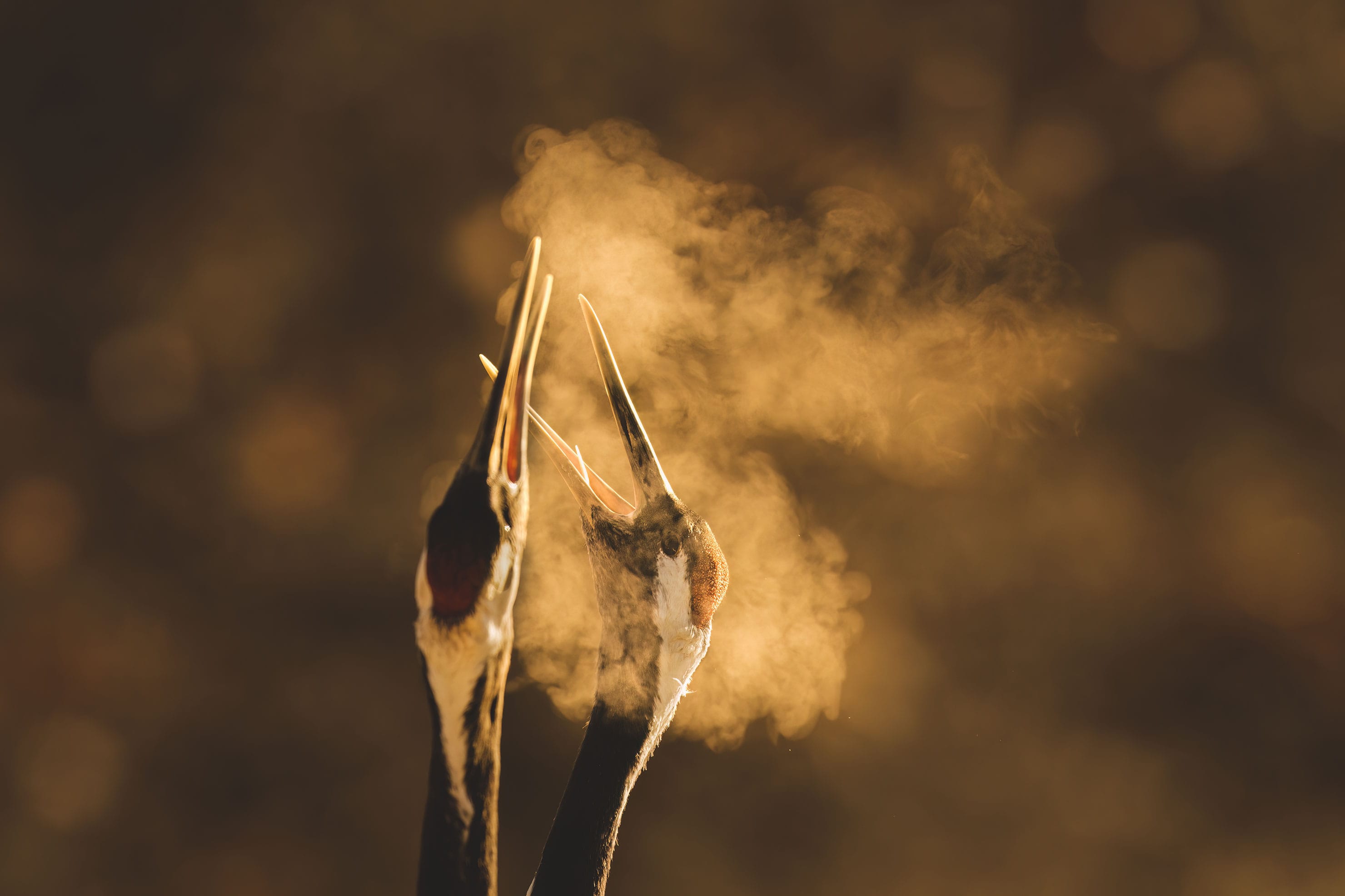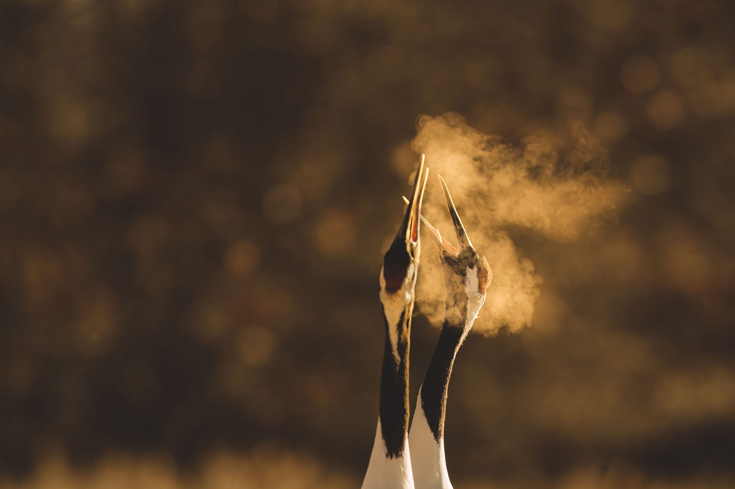 タンチョウのつがいが鳴き交わしながら吐き出す息が朝日を浴びている。600mmで撮影していたものの、のちにトリミングをしたくなった。APS-Cクロップをしても長辺6,240ピクセルも残っているのは、撮影後のトリミングで作品をさらに追い込むときの大きな味方になる。