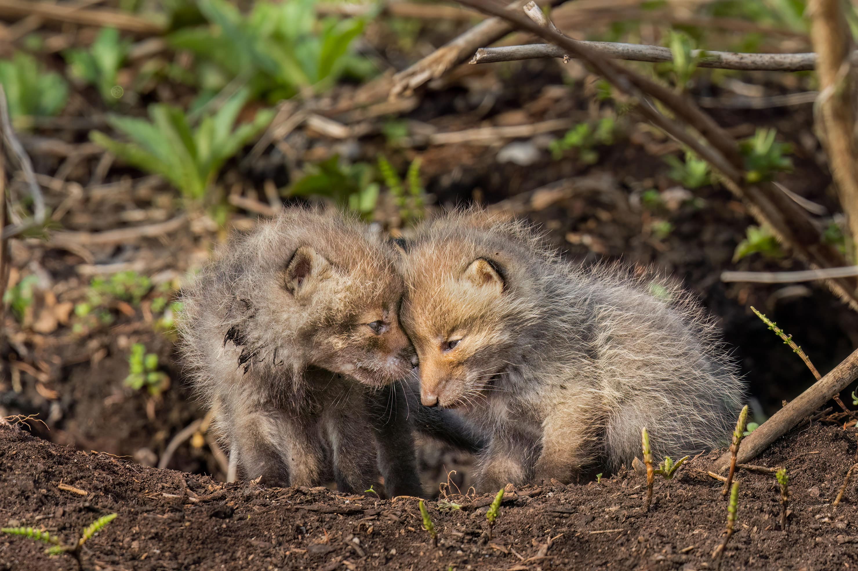 離乳して固形食を食べ始めた子ぎつねたちのもとに食べものを運びつづけるきつね母さんが、急ぎ足で横切っていった。