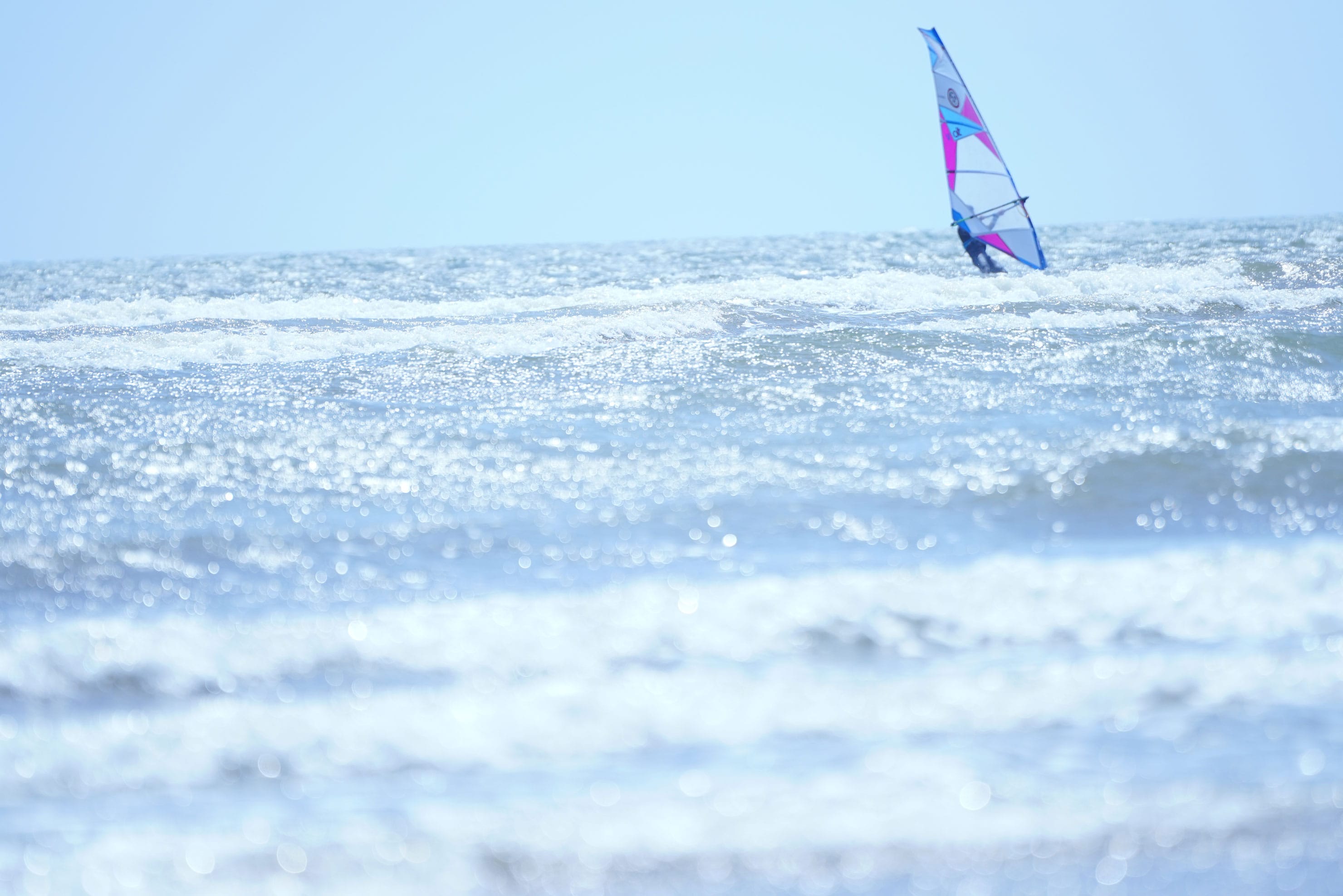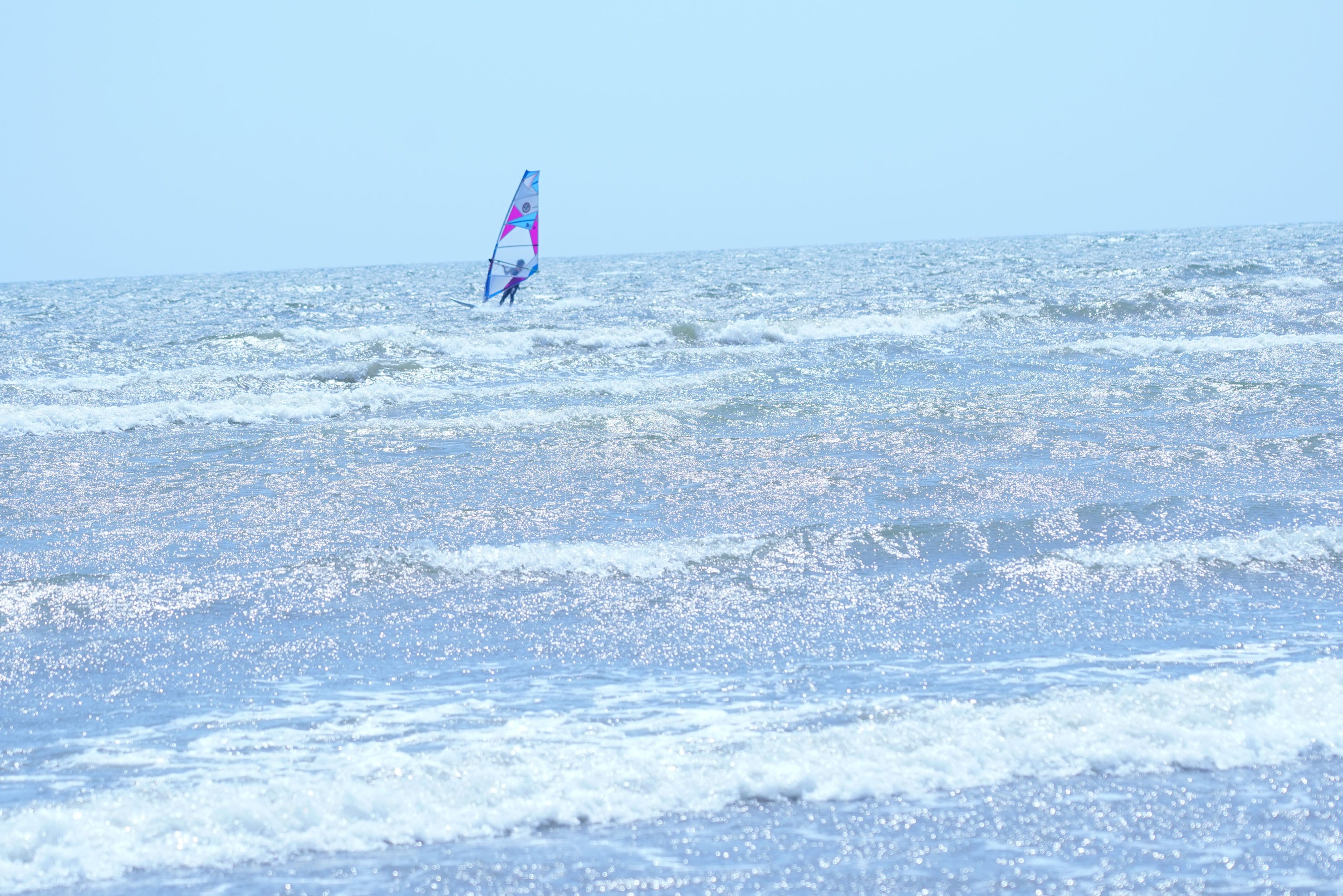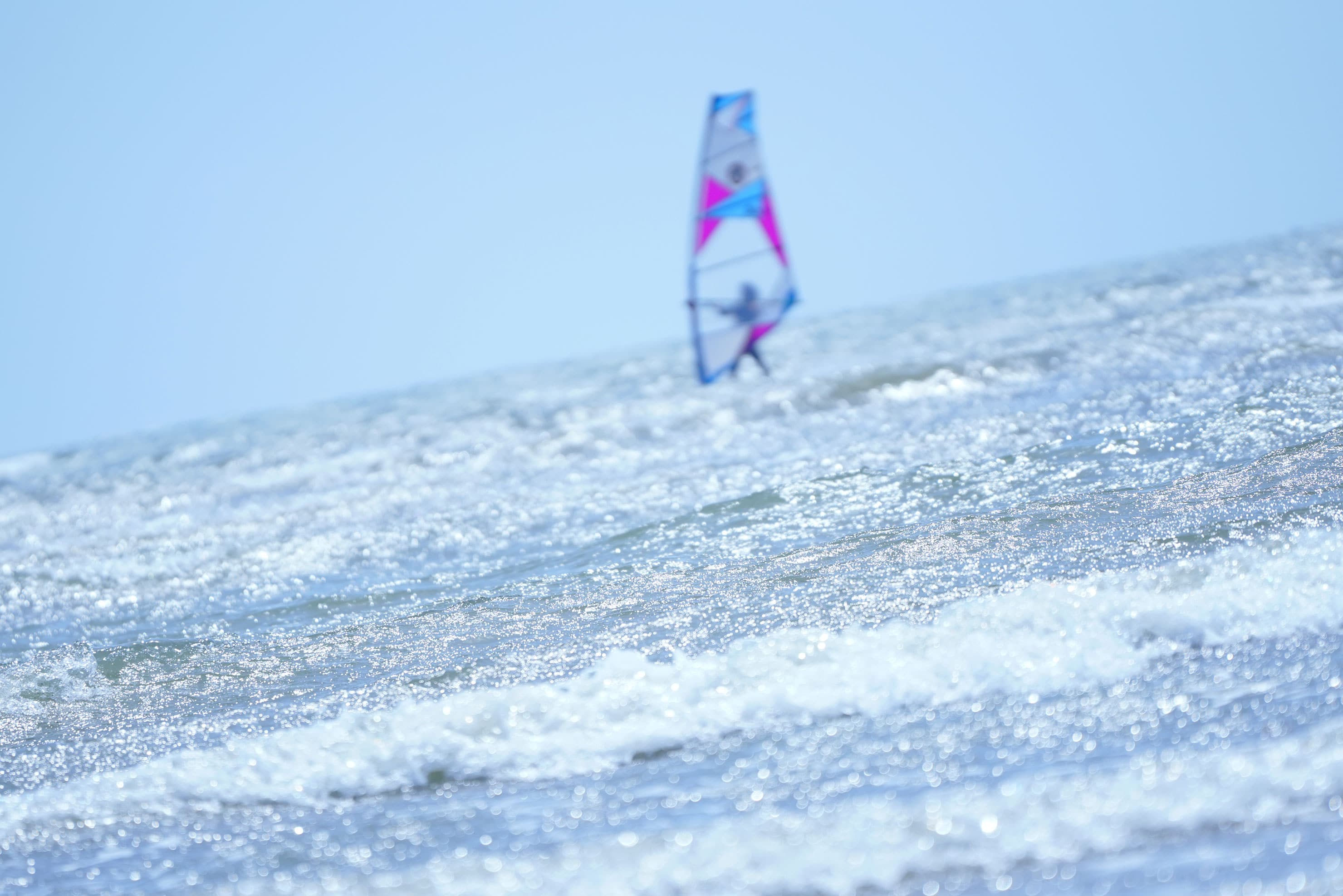 砂浜を歩いていると、ウィンドサーフィンをするたくさんのサーファーの姿が。風が強いので、ものすごい速さで右に左に進んでいく。連写に切り替えて撮影をスタート。SONYα7RⅢは、秒間10コマ撮影が可能。