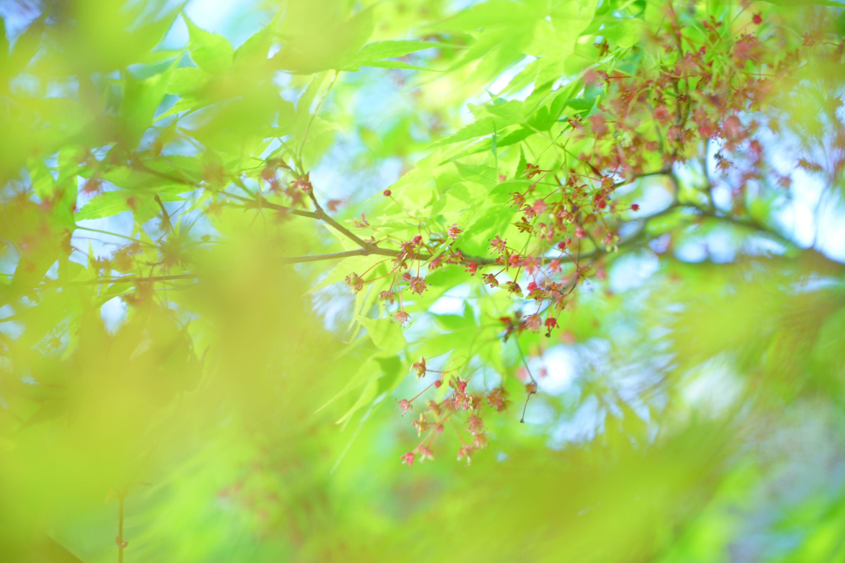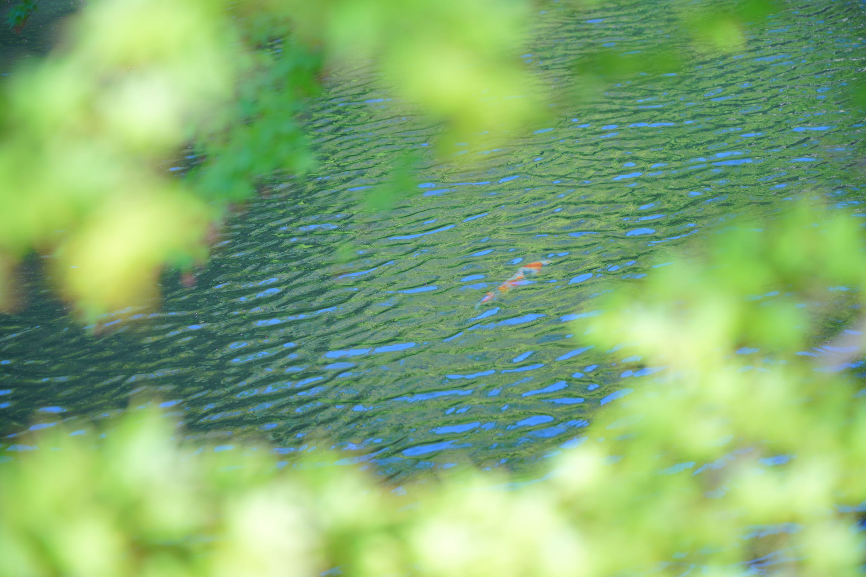 まずは、日陰にある池を撮影。春色のもみじの葉の間から時折入り込む光がキラキラと輝いたり。