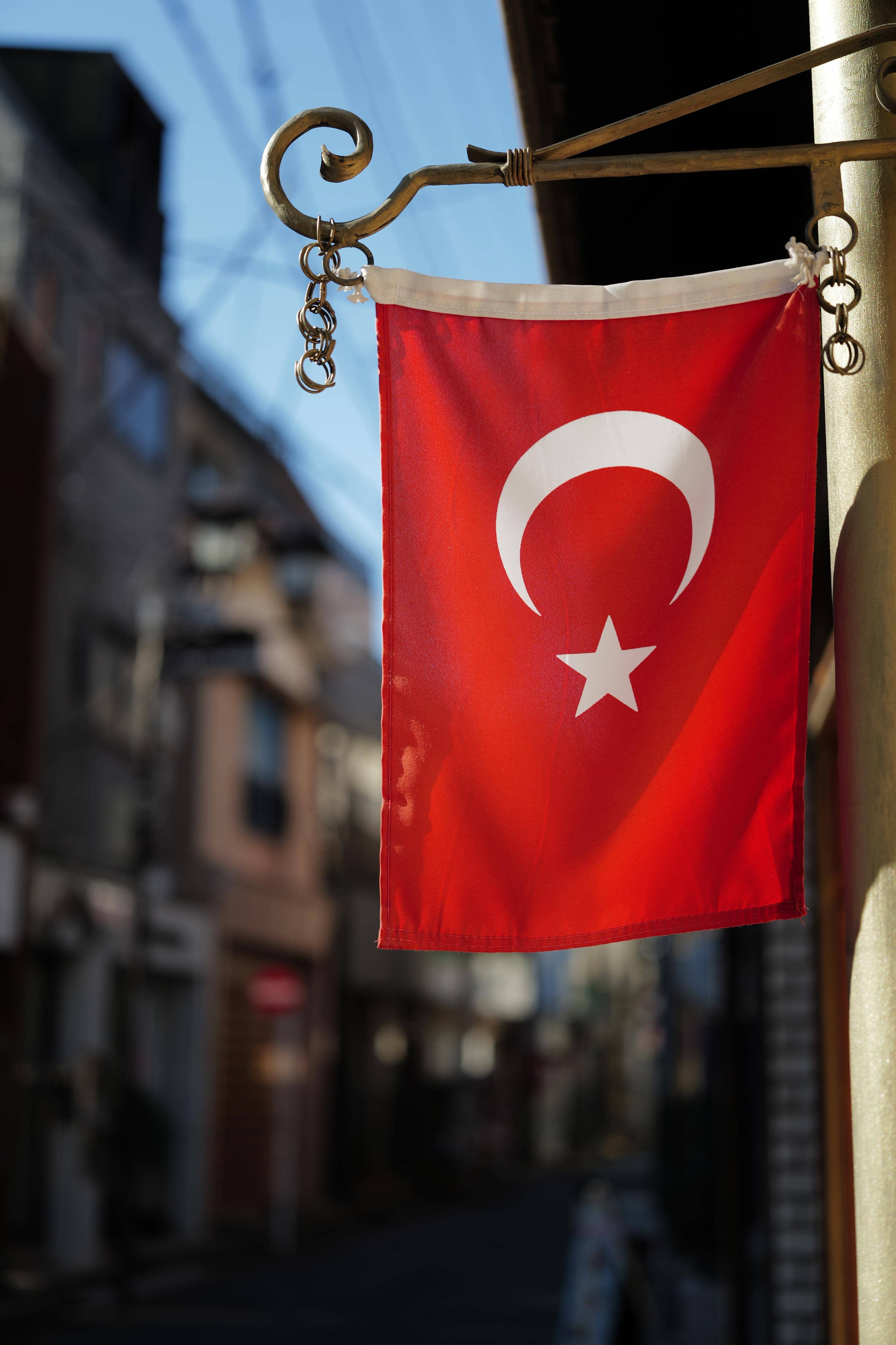 トルコ料理店の前にかかっていた国旗。そこに光が差し込んでいます。レスポンスに優れたLeica SL3-Sは、その瞬間を即座に捉えられました。