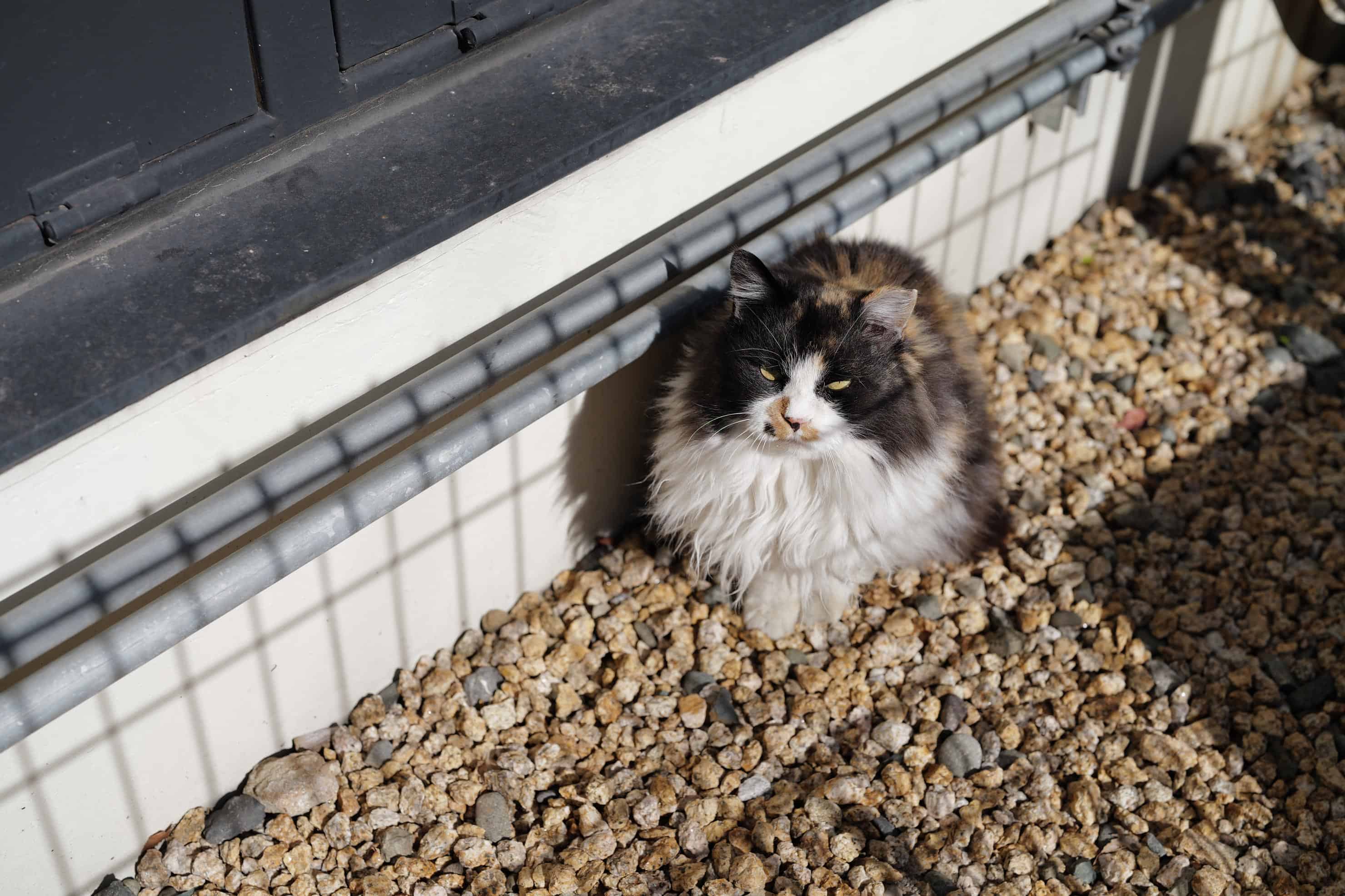 歩いていると柵の向こうにネコを発見。AFモードを動物認識に設定し、背面モニターをチルトさせて柵の上から狙いました。Leica SL3-Sは瞬時にネコを認識。こちらを見た瞬間にシャッターを切りました。