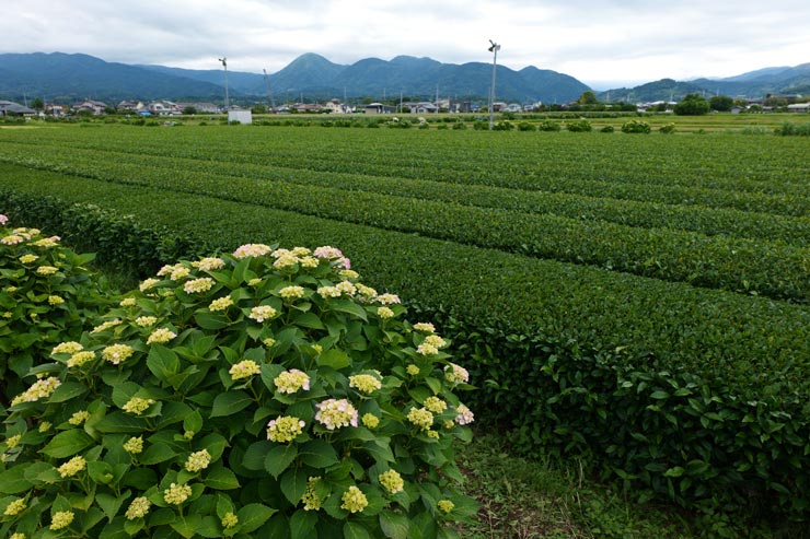 アジサイと茶畑。すっきりしない空でしたが、「LUMIX S1II」は的確なホワイトバランスで梅雨空を表現してくれました。新レンズ「LUMIX S 24-60mm F2.8」はテレ端を短くしたおかげで携行しやすくていいですね