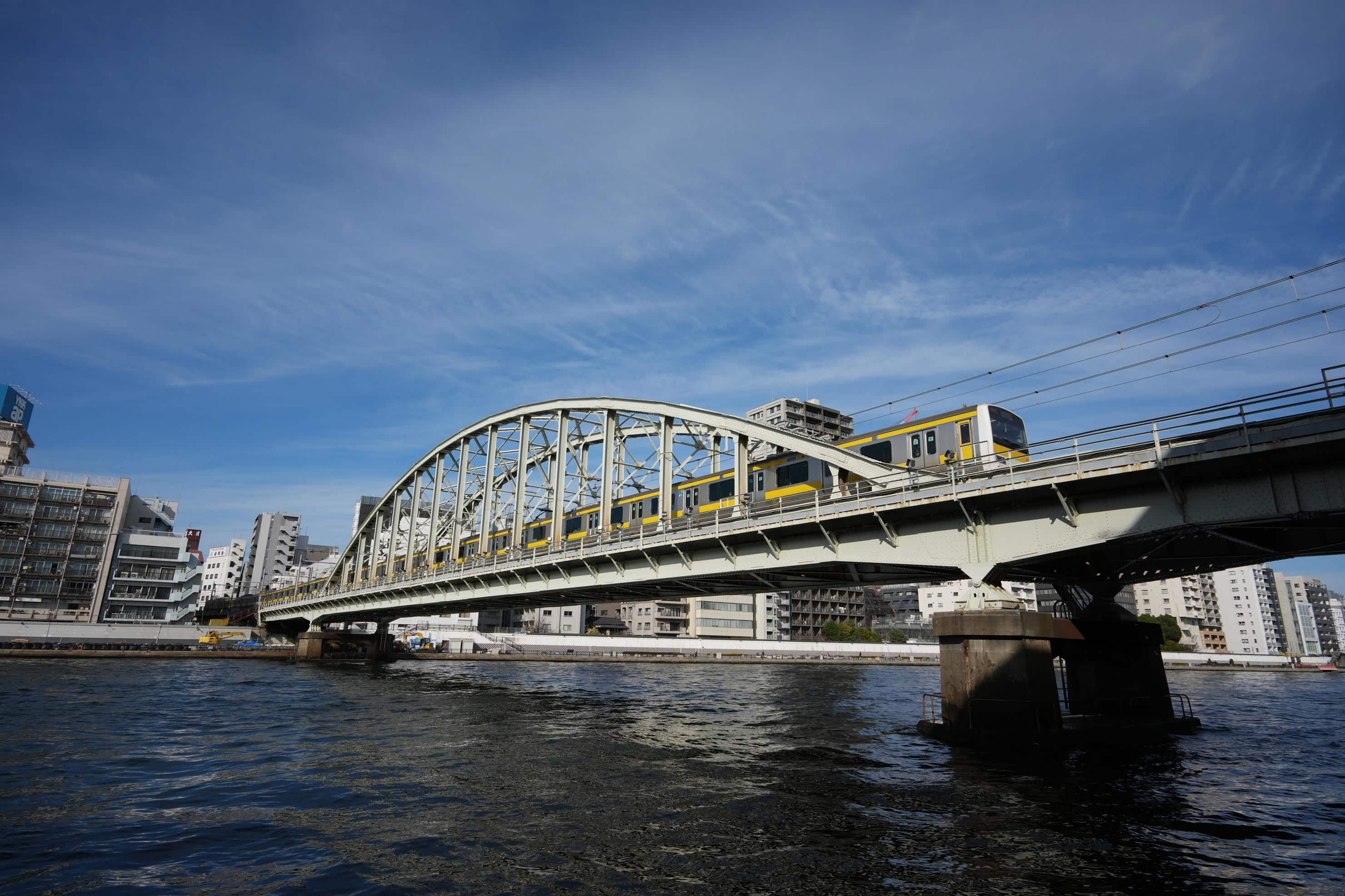隅田川橋梁を渡る総武線の姿をテラス左岸側から狙った一枚。最広角側に設定しての撮影ですが、F8まで絞ると周辺光量落ちも気にすることなく撮影できました。