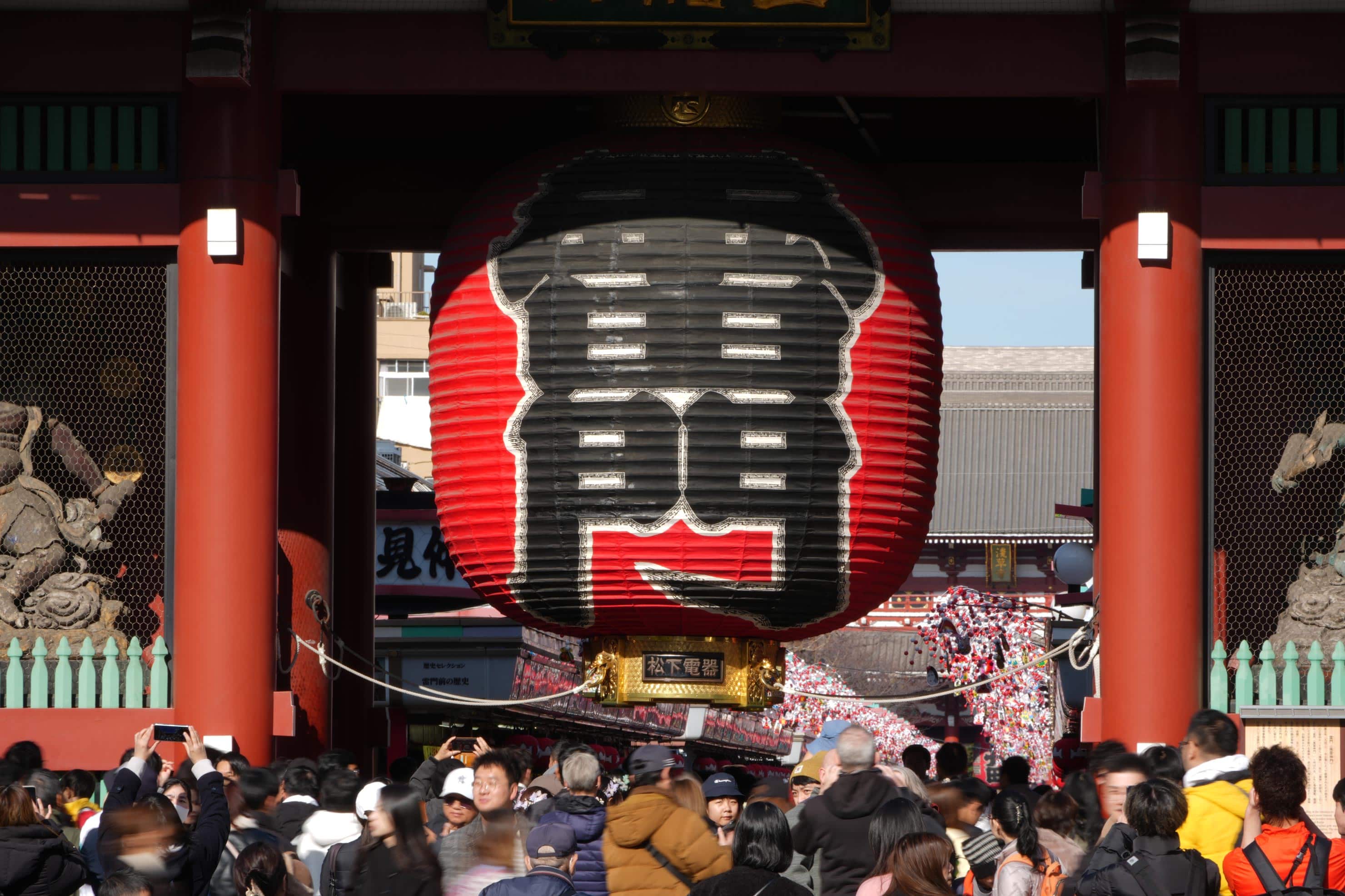大晦日、交差点の向こうから風雷神門(通称:雷門)の姿を200mmで切り取ると、人々で賑わう門前の様子から浅草寺へと続く参道の雰囲気までを一枚に収めることができました。