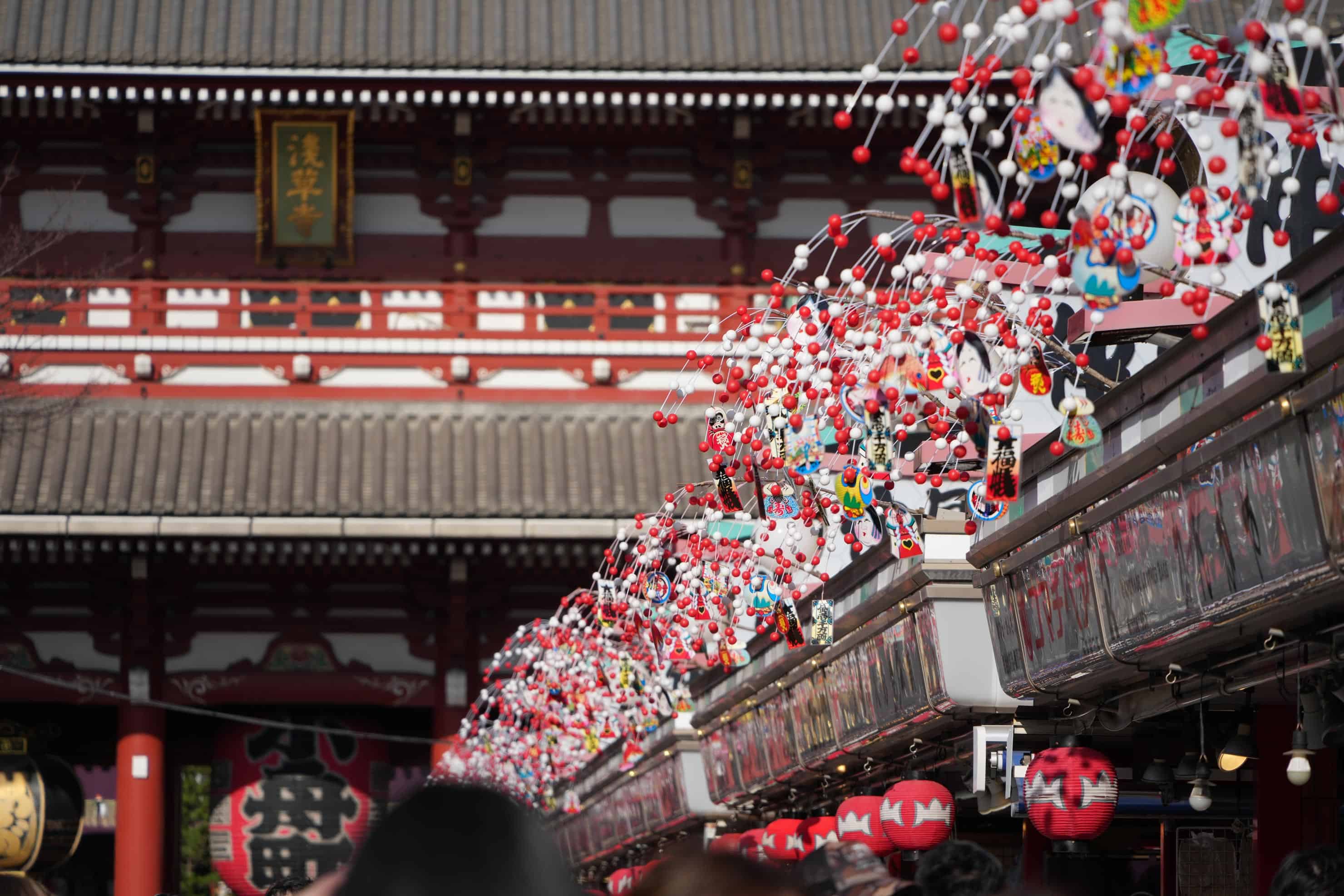 仲見世通りを彩る正月飾りと宝蔵門の様子を一枚に収めるべく、カメラのバリアングルモニターを使って撮影。冬晴れの一日らしく、正月飾りの彩りが華やぐ門前町の様子を伝えてくれます。
