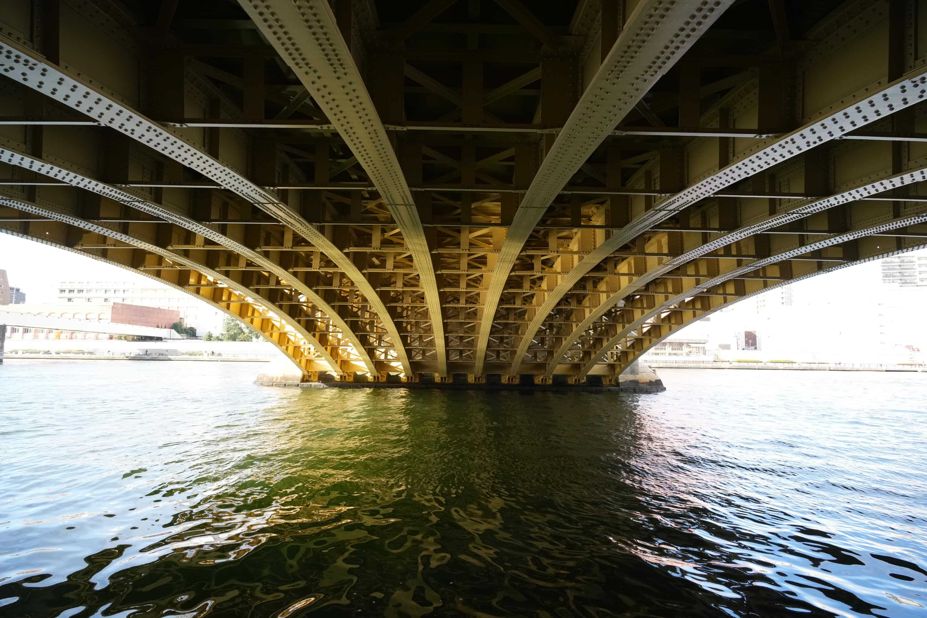 関東大震災の復興計画によって整備された蔵前橋。石川島造船所(現在のIHI)によって建造された橋の下部構造物を見上げると、リベット止めされた鋼鉄が幾重にも連なる構造をよく観察することができます。最広角側で撮影していますが、像の乱れもなく隅々まで描写されていることが分かります。
