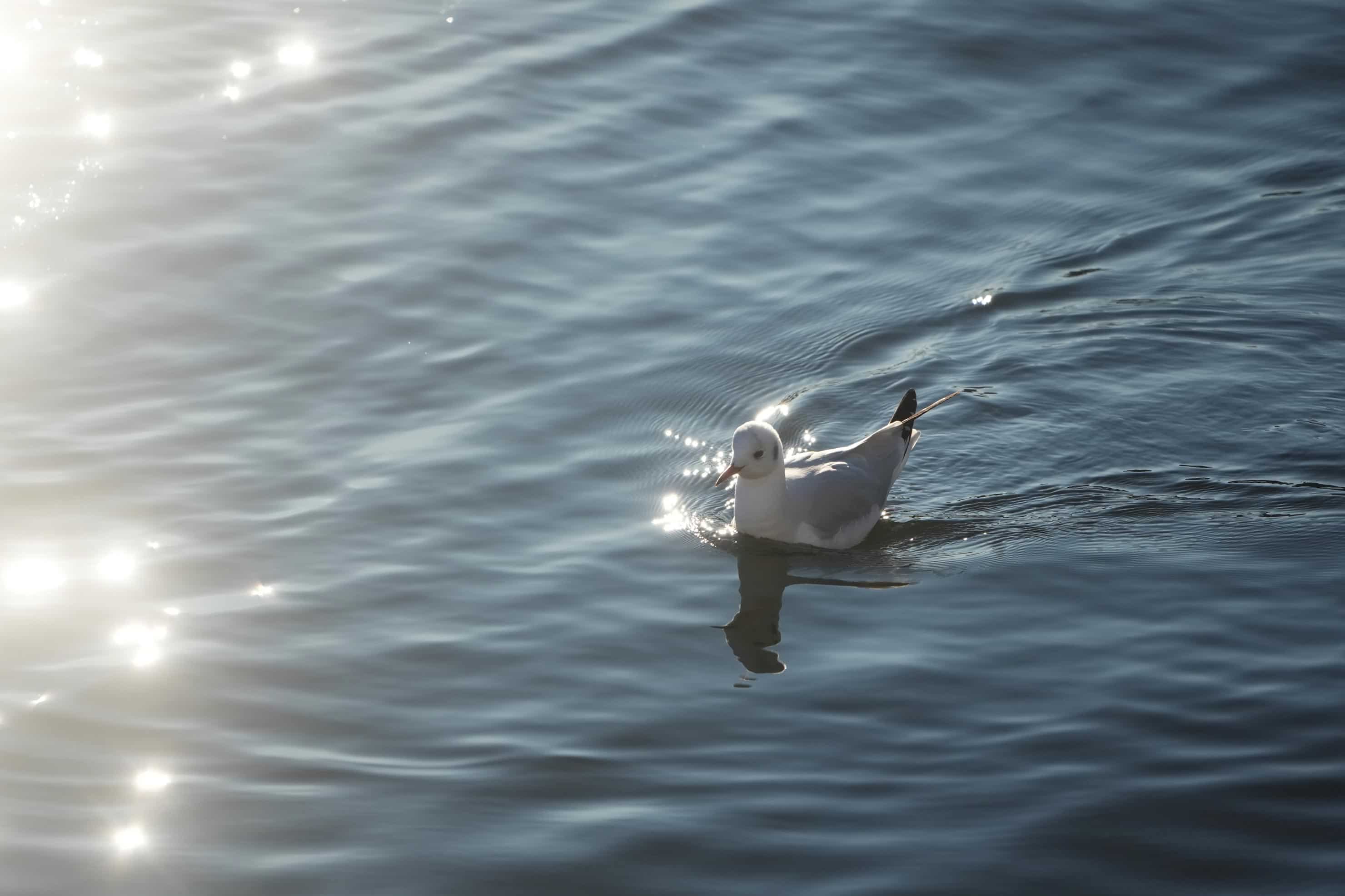 朝日に照らされきらめく水面を行くユリカモメ。レンズの内面反射が適切に抑制されているため、破綻ない描写が楽しめるのは現代のレンズならでは。