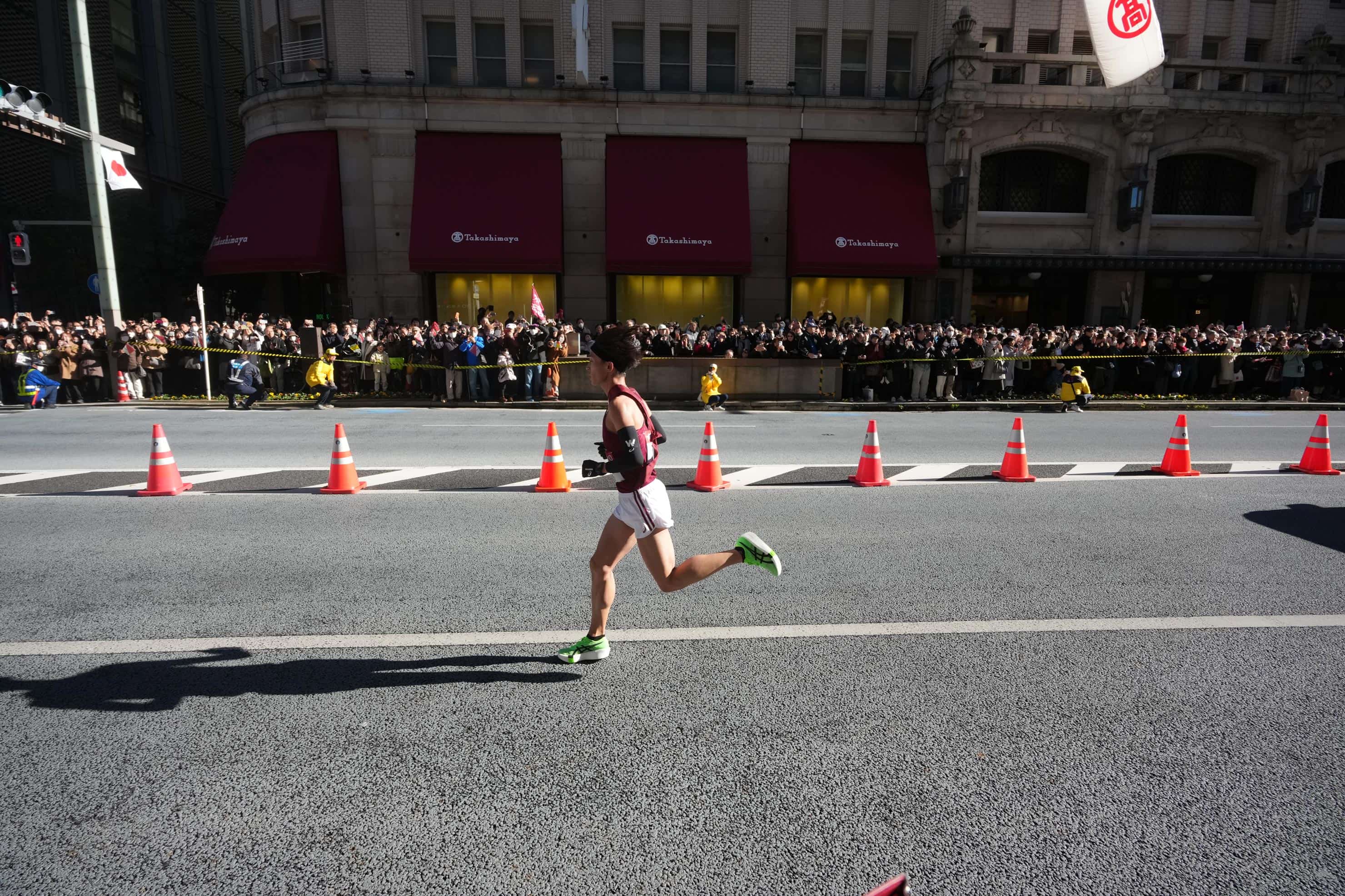 第102回東京箱根間往復大学駅伝競走(通称:箱根駅伝)復路。普段は多くの車で埋め尽くされる中央通りも、このときは完全封鎖され異次元の空間が現れます。トップから遅れること約6分50秒でこの場所に現れたランナーに、沿道から大声援が飛ぶ瞬間を20mmの画角に収めてみました。
