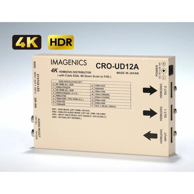 HDMI 1.4およびHDMI 2.0規格に準拠したデジタル映像音声信号の EDIDエミュレーション機能およびケーブル補償器付きの1入力2分配器 アナログ音声ディエンベデッダー機能およびHDMI信号へのエンベッダー機能にも対応
