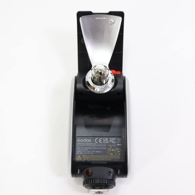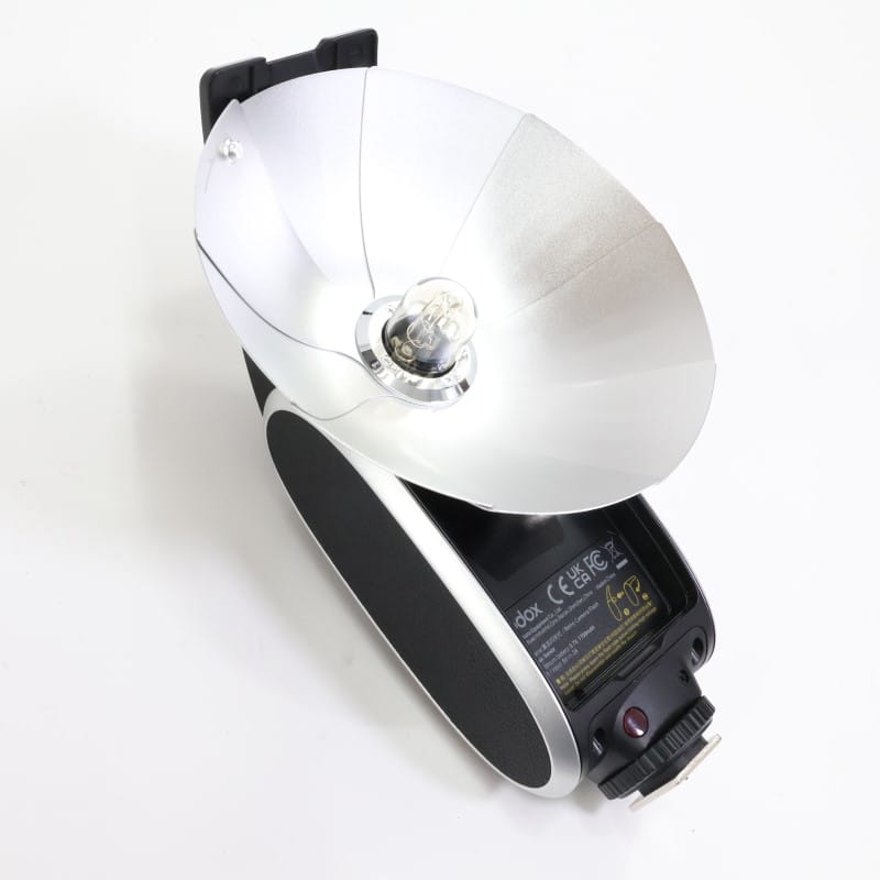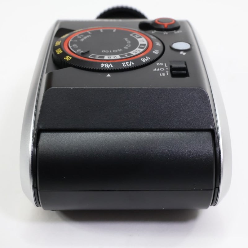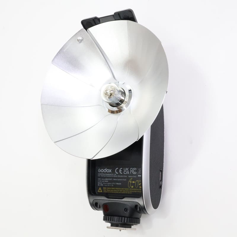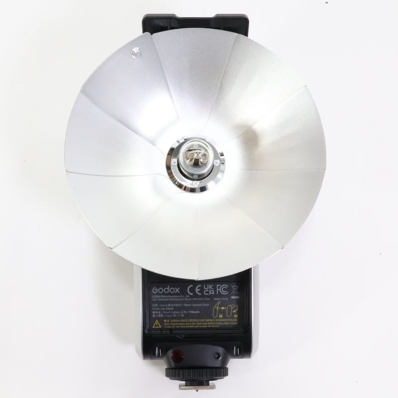 リフレクターとフラッシュバルブ調の発光部を持つ外観デザイン、機能美、また精巧な構造が特徴のカメラフラッシュ