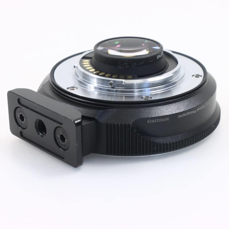 内部にレデューサーレンズが搭載されたマイクロフォーサーズマウントカメラ用の電子接点付きキヤノン EFマウントアダプター