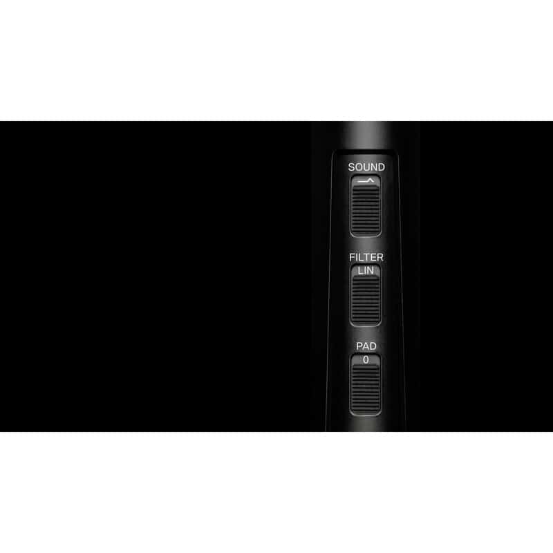 1台2役。スイッチで2つのサウンドキャラクターを使い分けられる楽器用コンデンサーマイク  内蔵のAIRおよびFLATキャラクターを使い分けることで、2つのサウンドキャラクターで収音可能