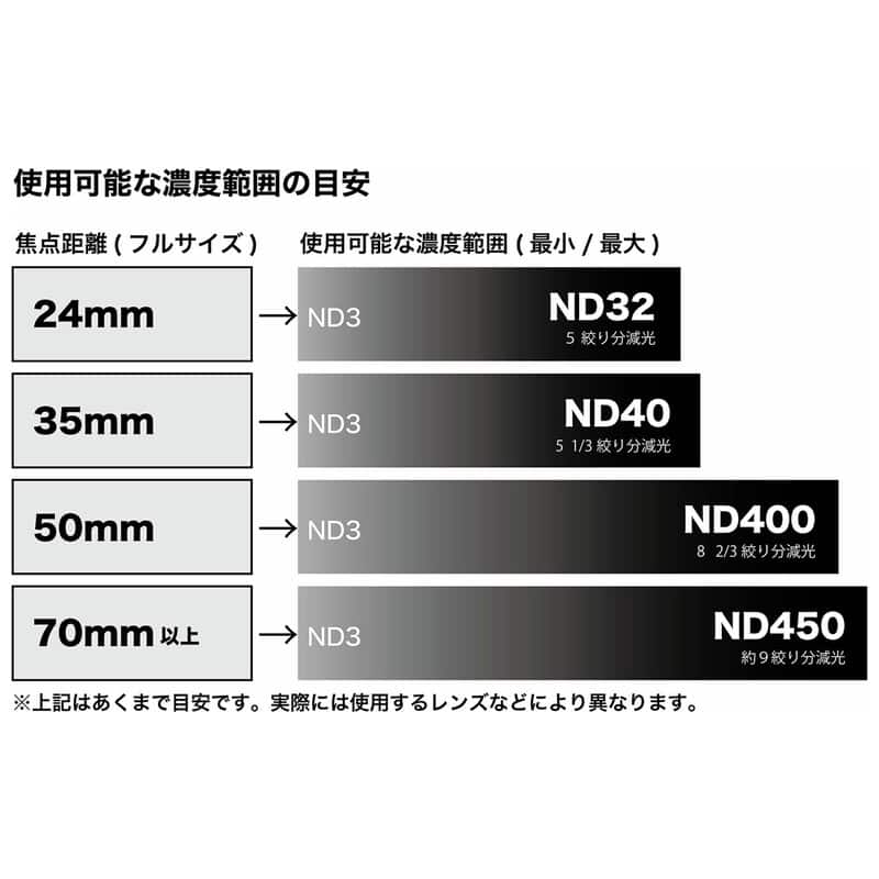 *焦点距離70mm以上で使用の場合にND450相当までお使いいただけます。濃度をMaxに近づけた時に映像にX状のムラを生じることがあります。使用するレンズの焦点距離が短いほどこの現象は起こりやすくなります。